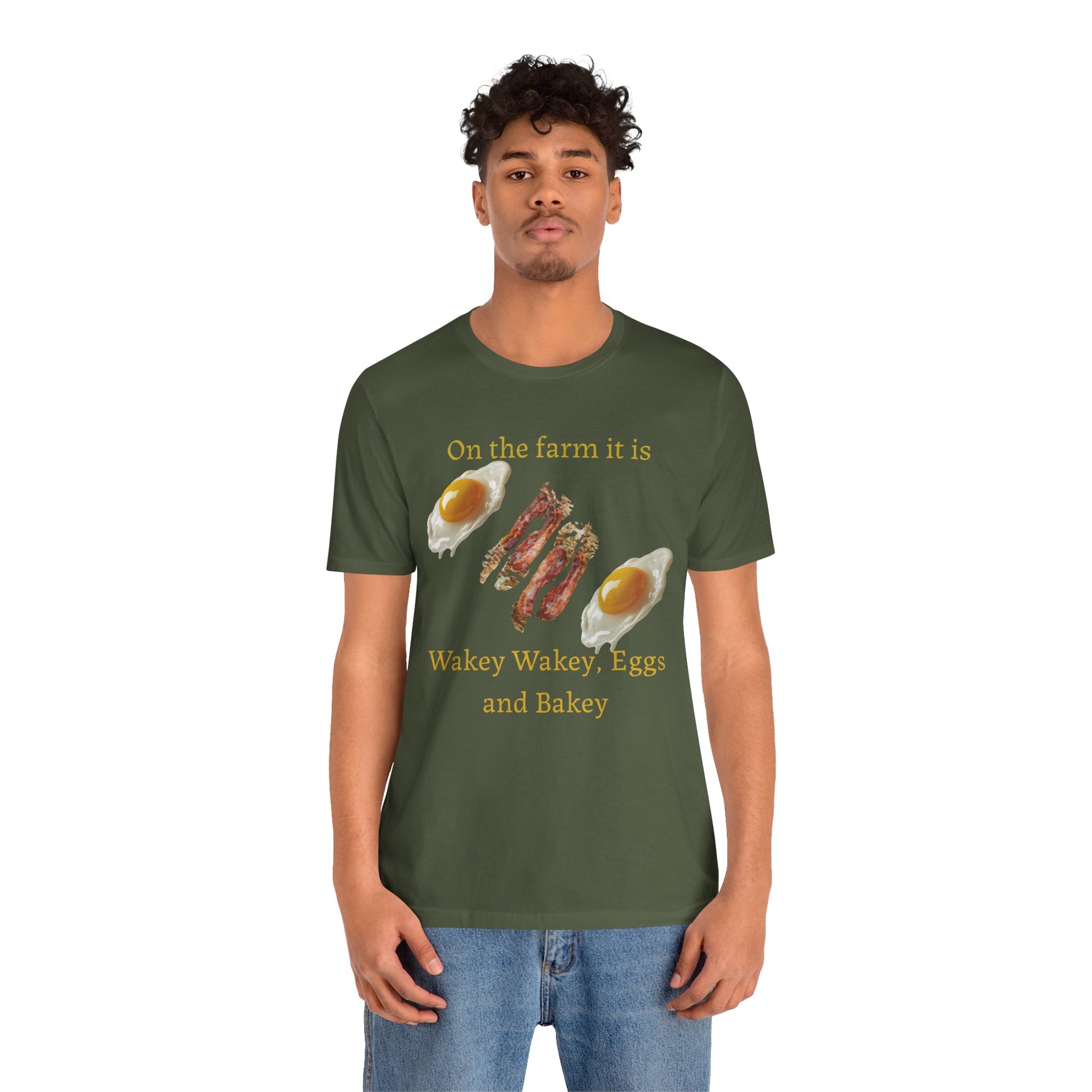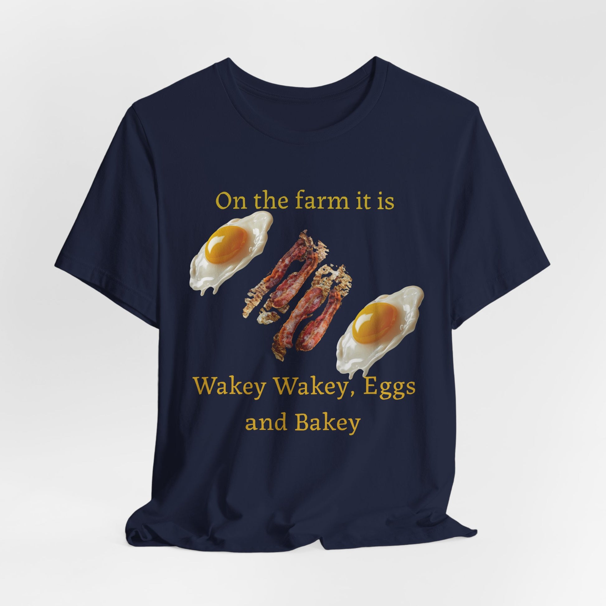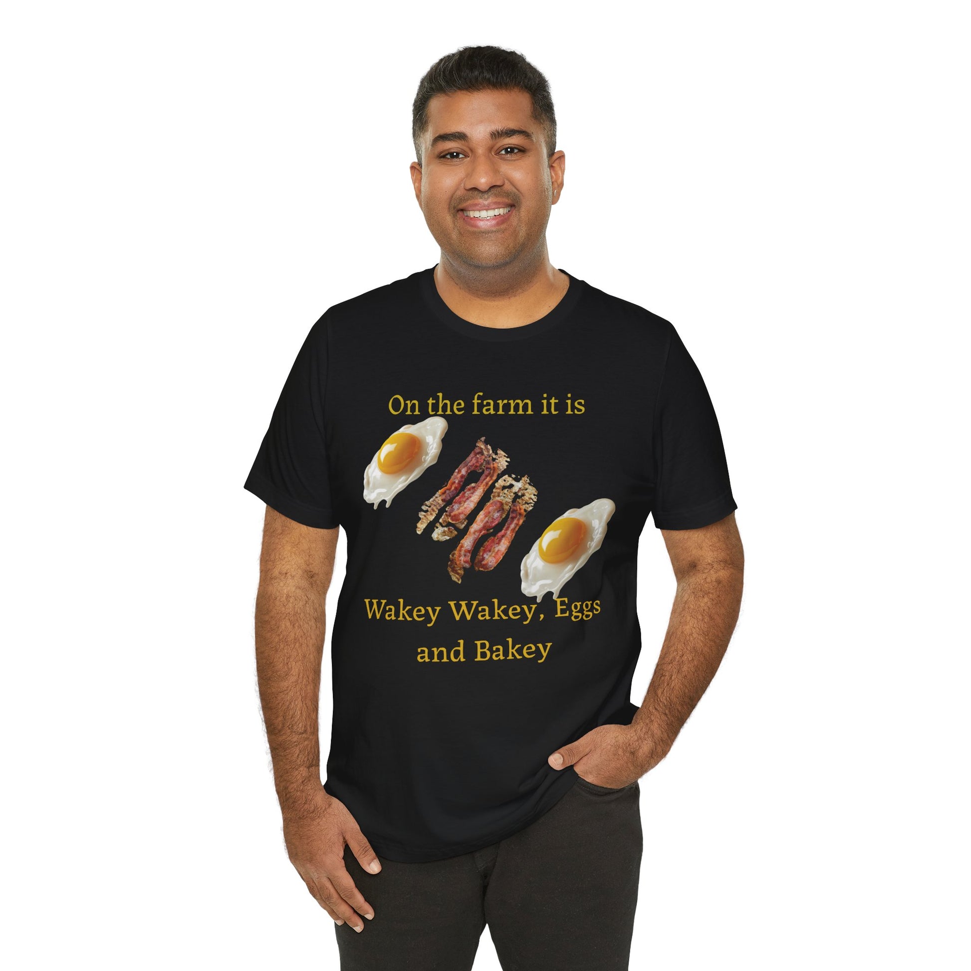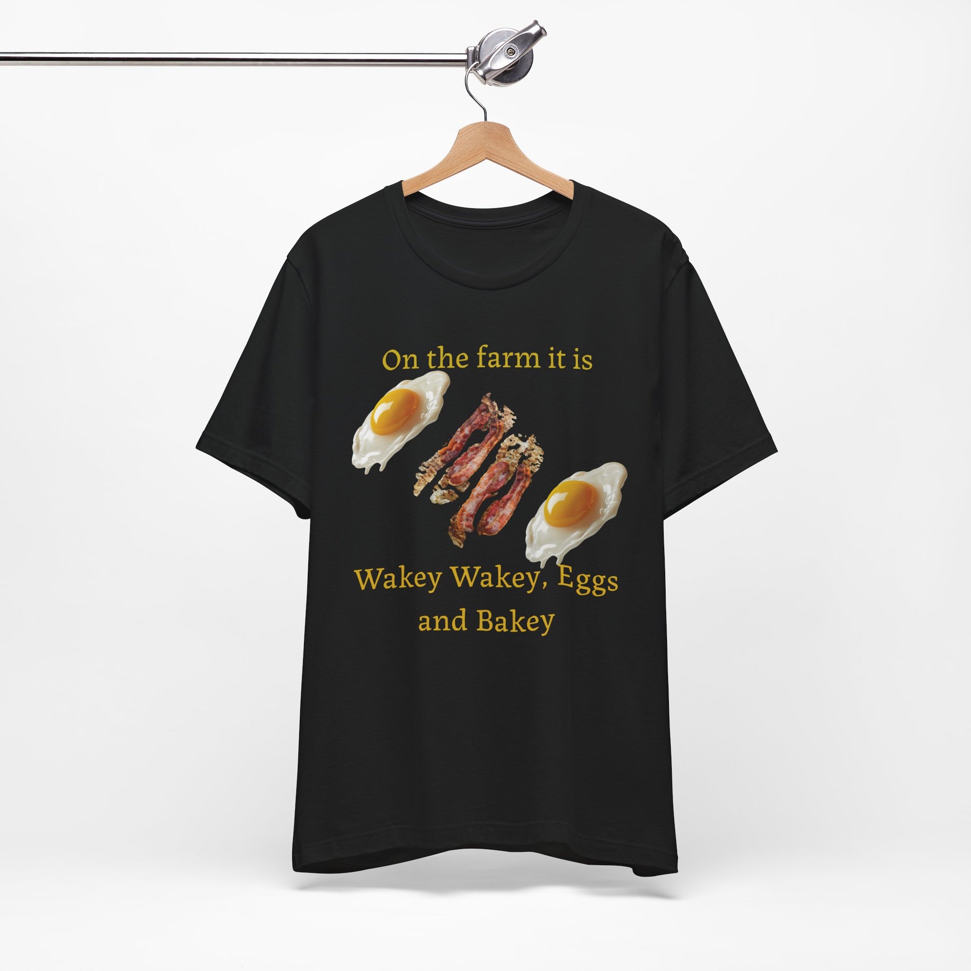 A comfortable and stylish tee shirt featuring a graphic of 2 fried eggs and 4 strips of bacon with the text 'On the farm it is Wakey Wakey, Eggs and Bakey'. Perfect for breakfast lovers and those who enjoy a fun and quirky style. Ideal for casual wear and lounging around at home. Great for celebrating National Bacon Day or any morning occasion.