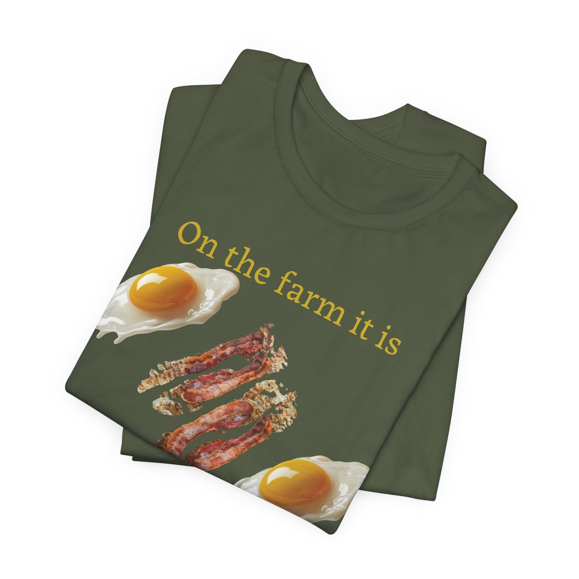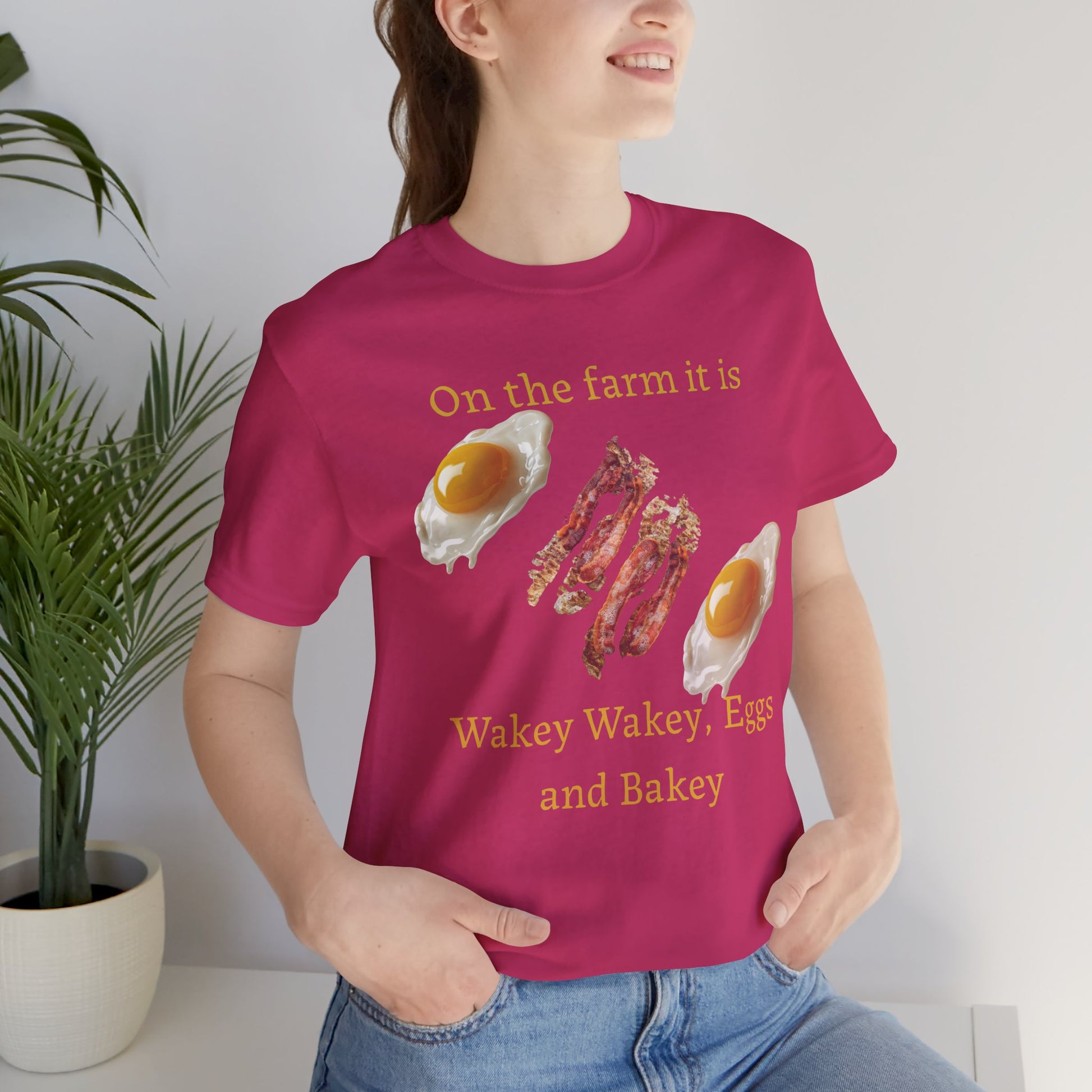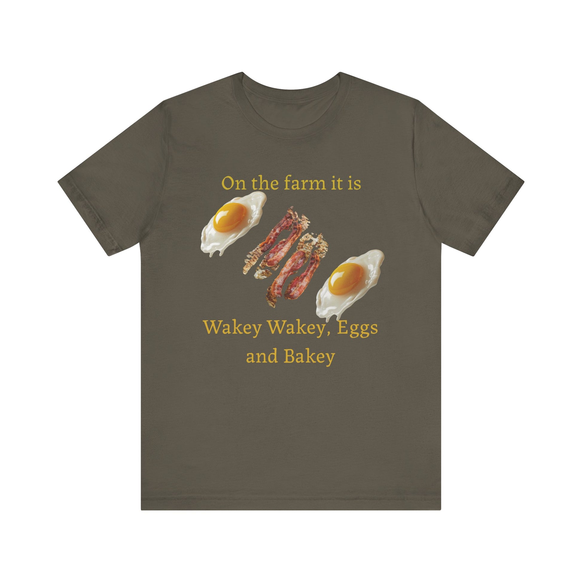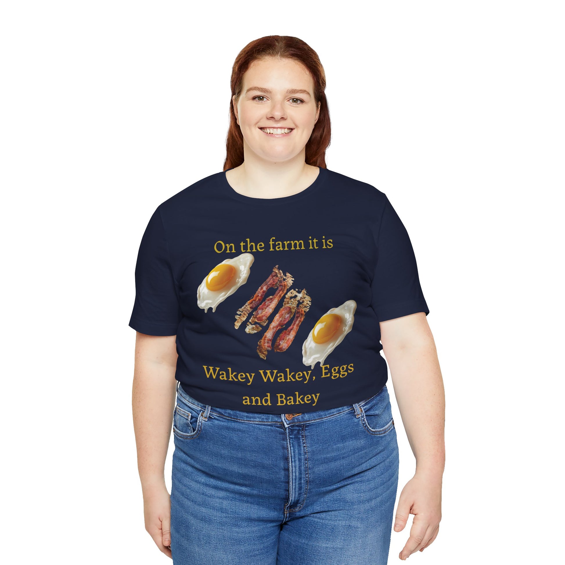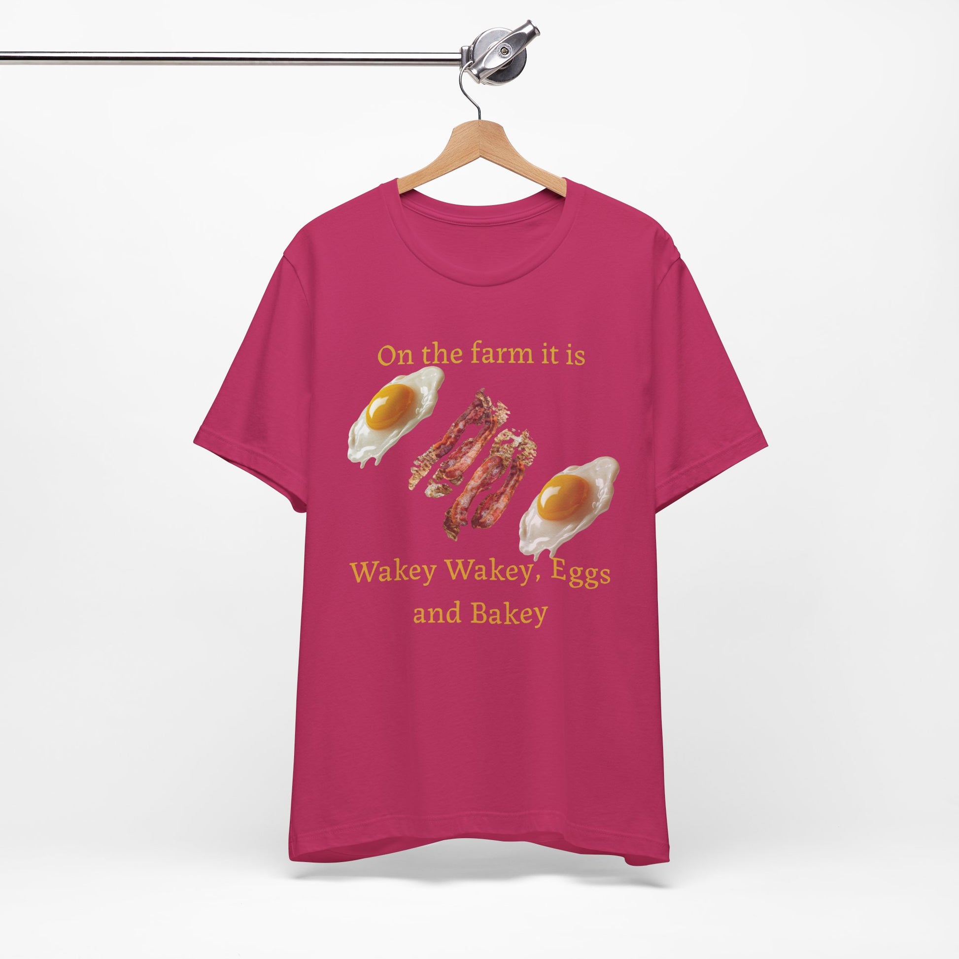 A comfortable and stylish tee shirt featuring a graphic of 2 fried eggs and 4 strips of bacon with the text 'On the farm it is Wakey Wakey, Eggs and Bakey'. Perfect for breakfast lovers and those who enjoy a fun and quirky style. Ideal for casual wear and lounging around at home. Great for celebrating National Bacon Day or any morning occasion.