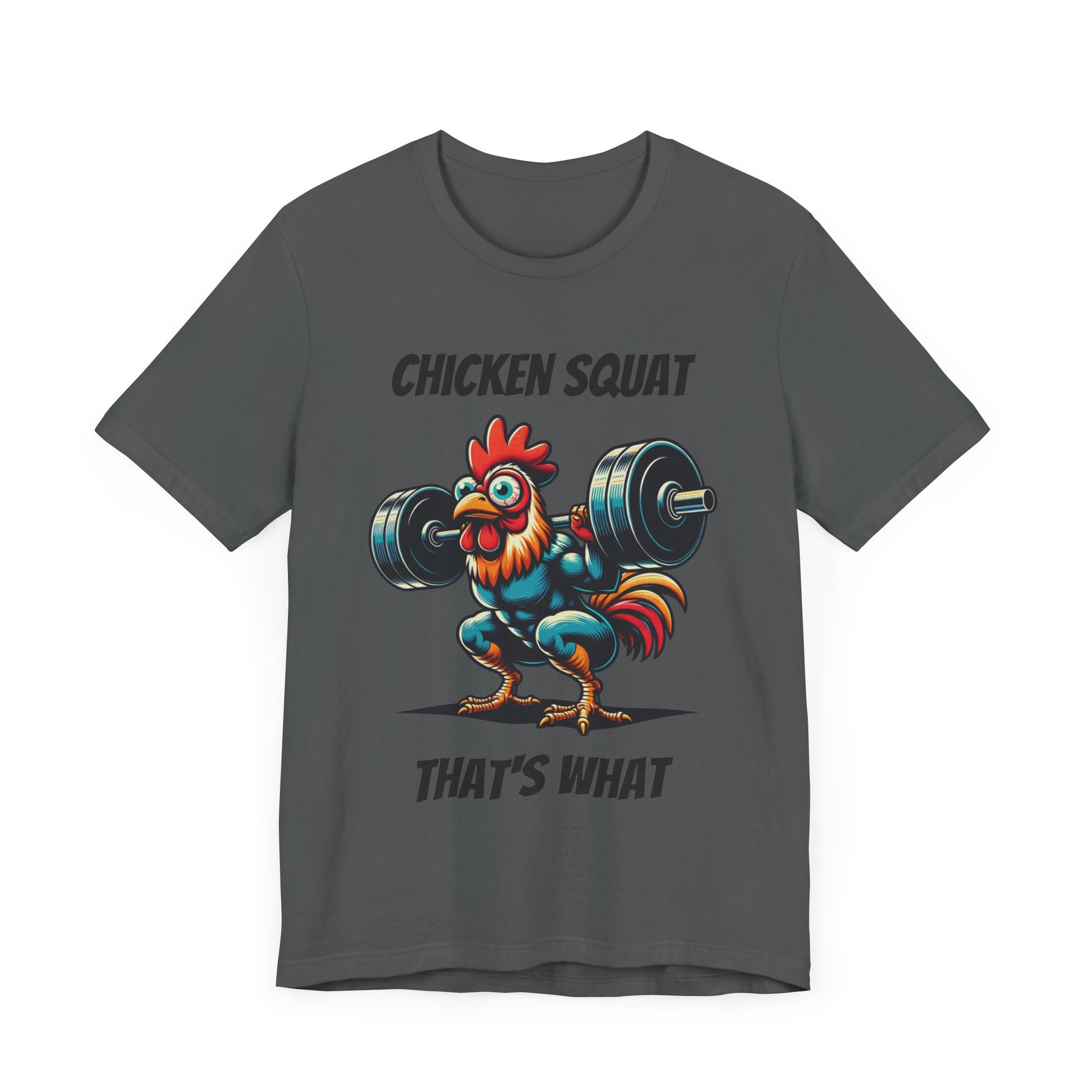 A graphic T-Shirt featuring a design of a chicken squatting a heavy barbell with a text that reads 'Chicken Squat That's What'. This fun and quirky T-Shirt is perfect for fitness enthusiasts with a sense of humor. Great for gym workouts or casual wear. Ideal for those who enjoy weightlifting and want to add a playful touch to their wardrobe. Perfect for gifting on birthdays, holidays, or as a fun surprise for gym buddies.