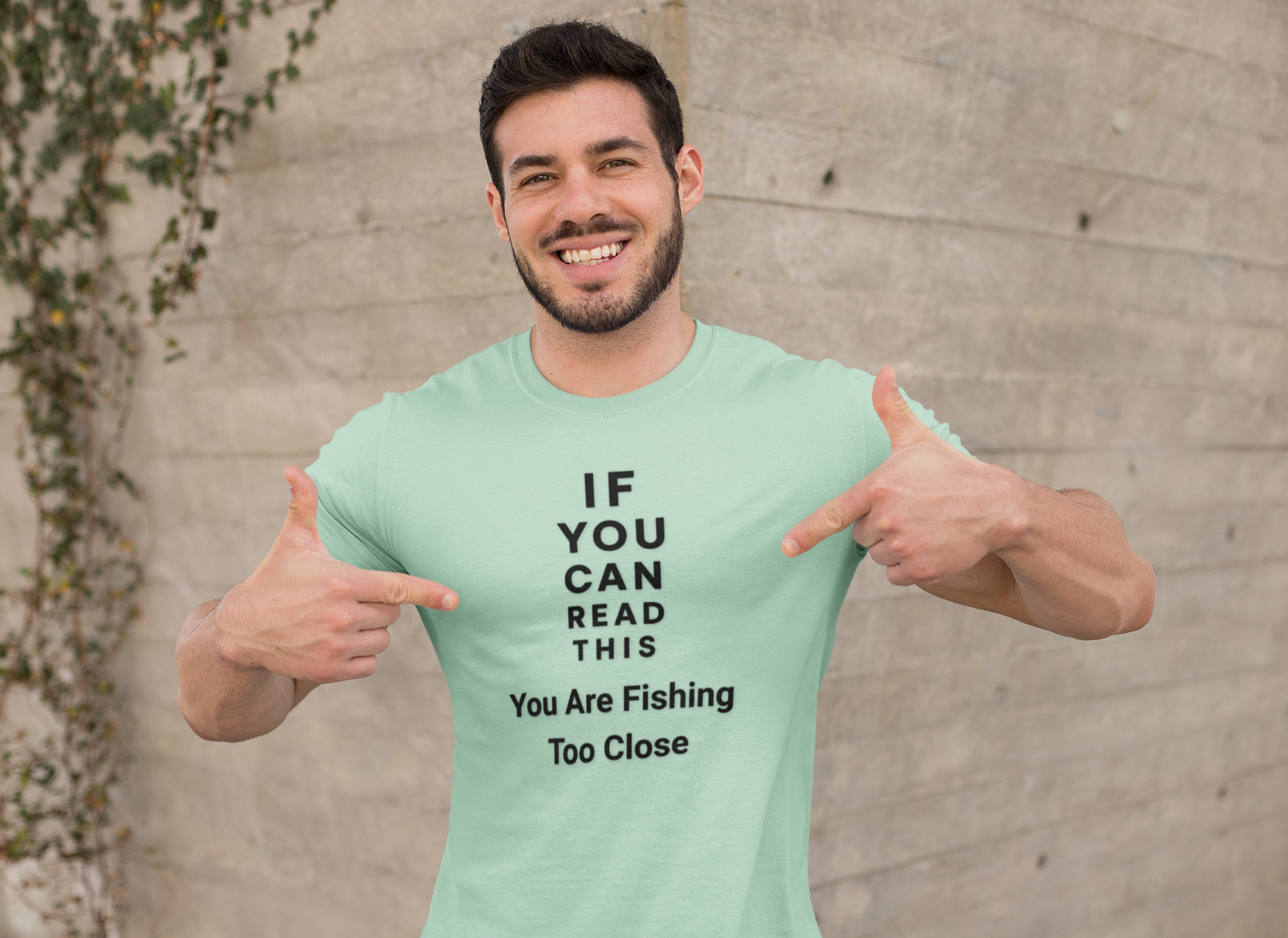 This t-shirt features a text design that says "IF YOU CAN READ THIS YOU ARE FISHING TO CLOSE." The design resembles an eye chart, creating a fun pun representing someone being able to read a chart during an eye exam. This shirt is perfect for fishing enthusiasts with a sense of humor, ideal for casual wear or as a conversation starter at fishing events or parties.