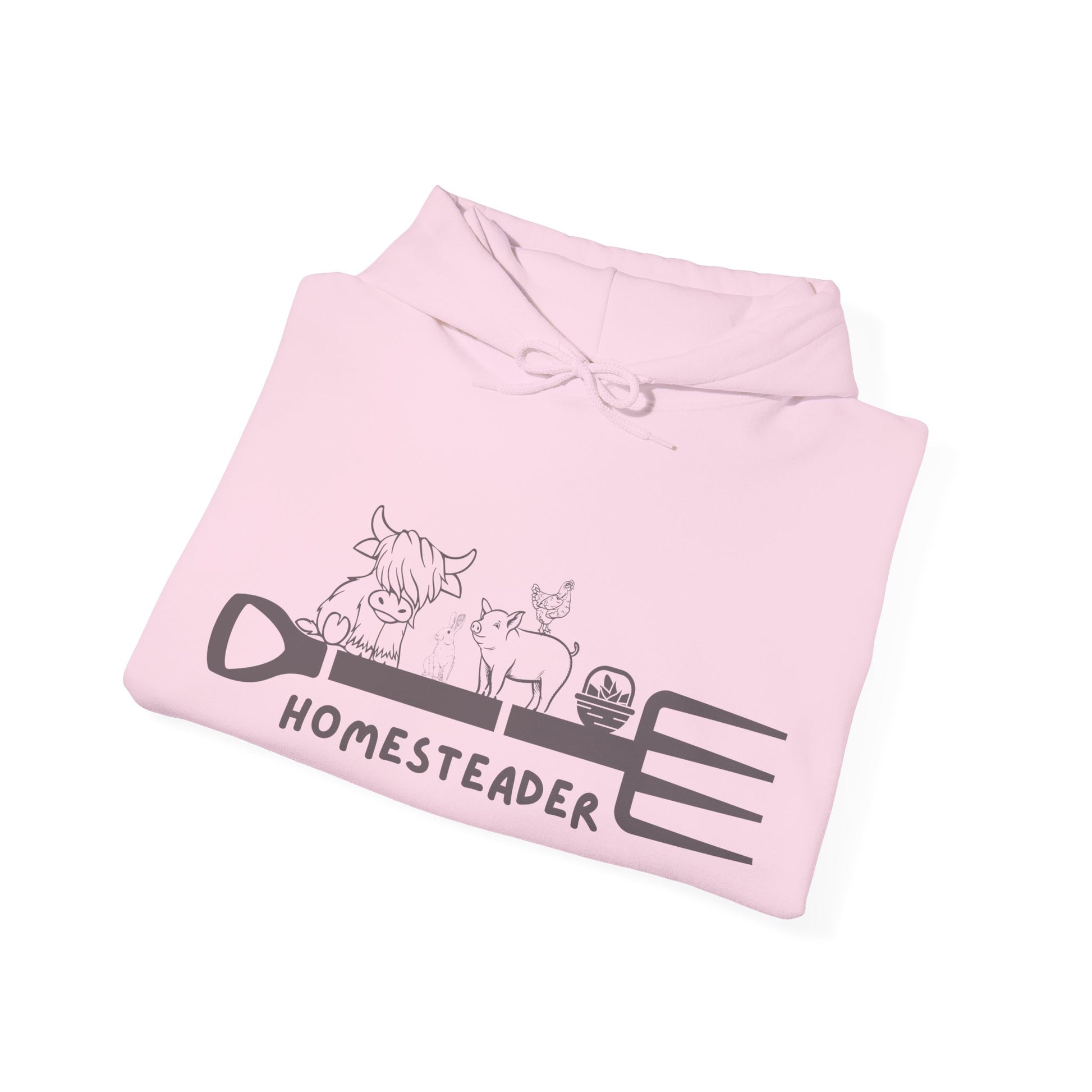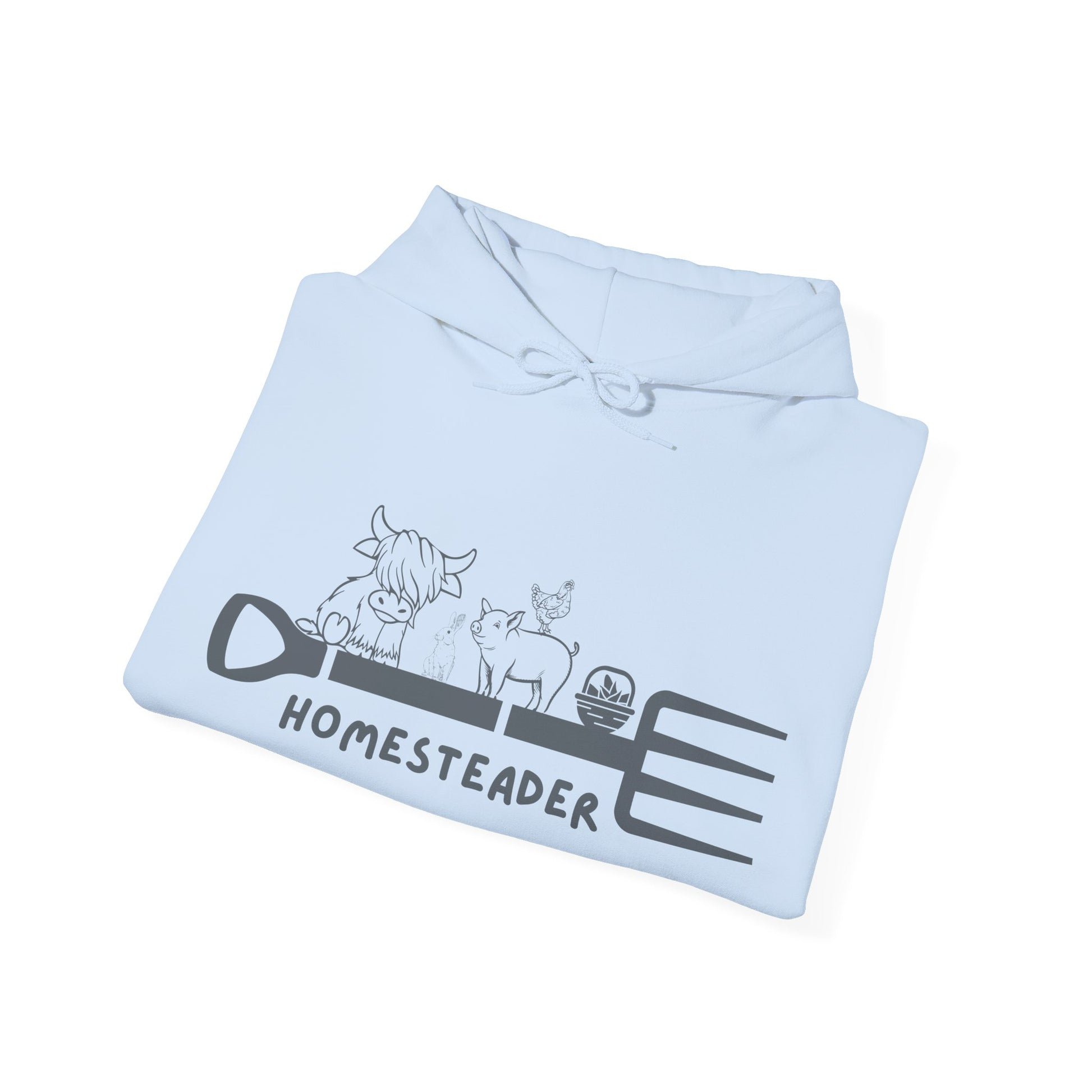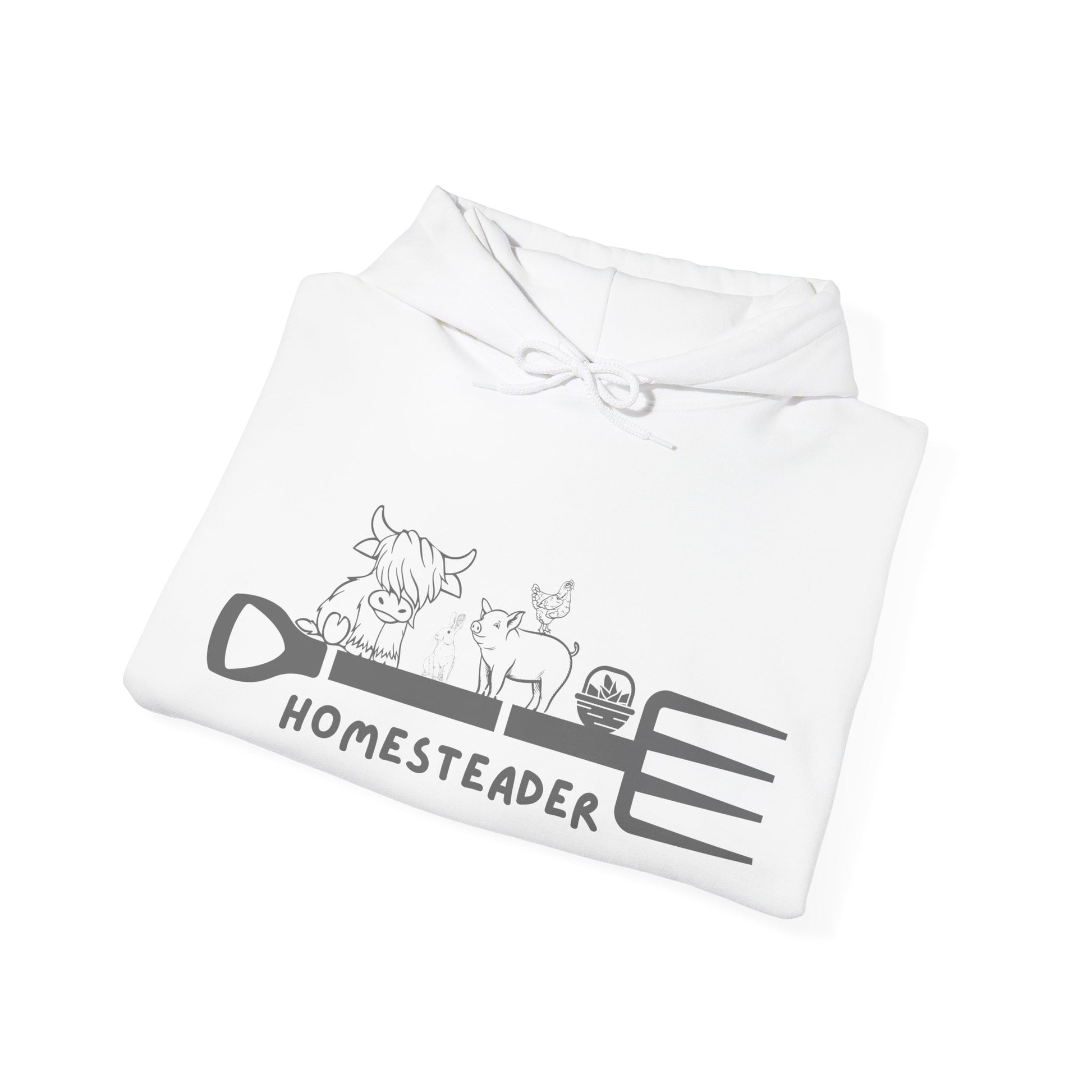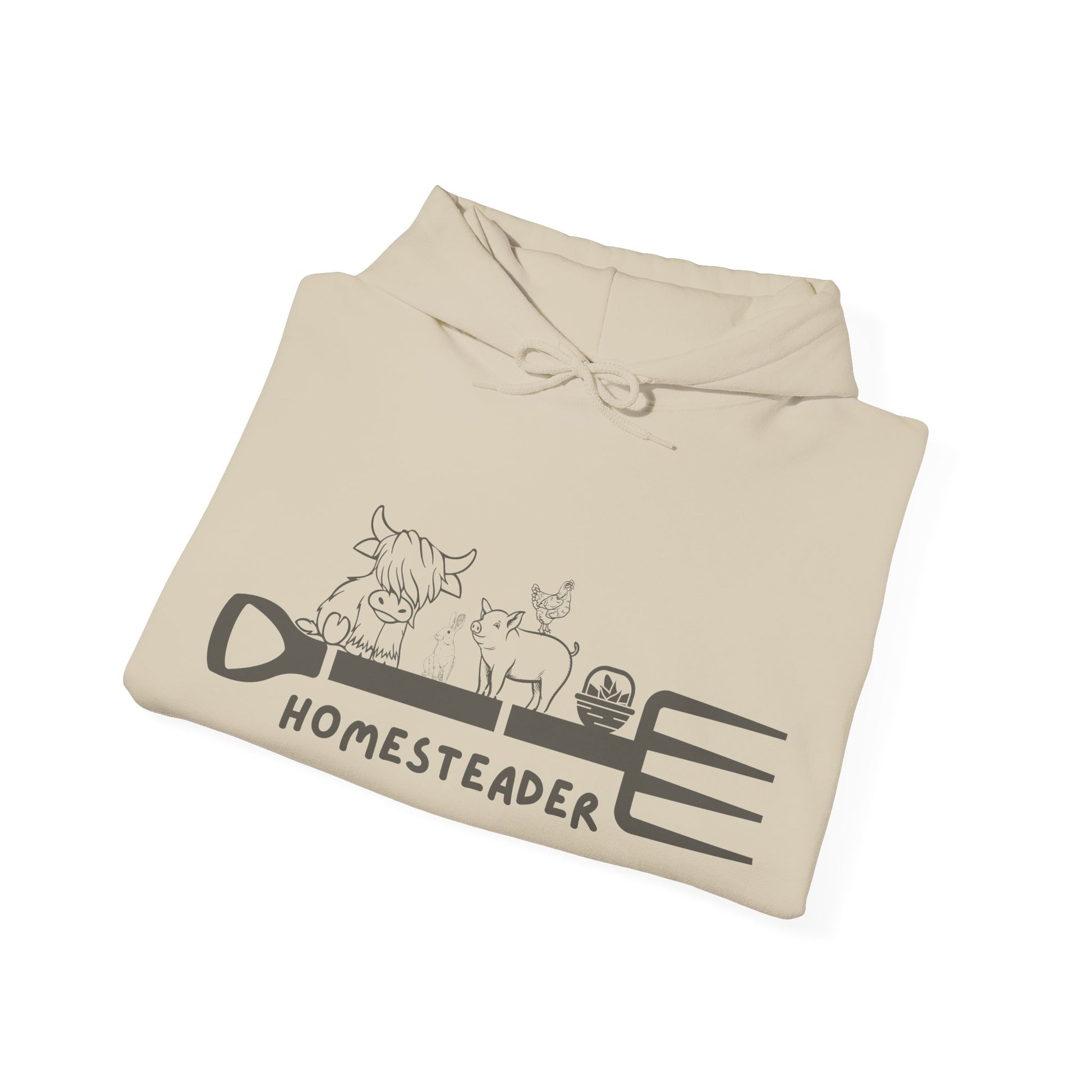 Stay cozy and stylish with this Unisex Heavy Blend Hoodie featuring a graphic of a garden turning fork with farm animals and the text 'homesteader'. Perfect for those who enjoy homesteading, farming, or rustic living. Ideal for casual wear or as a thoughtful gift for homesteaders, farmers, or gardeners. Relevant for holidays like Earth Day, Thanksgiving, and Christmas.