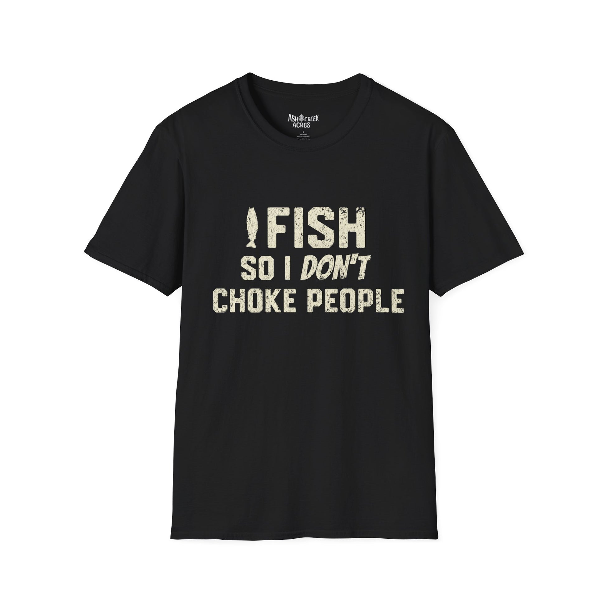 This shirt speaks in a dry grin and a quiet hook set — a black, soft-feeling tee that announces your escape hatch when people push your buttons. The distressed cream lettering reads “I FISH SO I DON’T CHOKE PEOPLE,” a blunt, funny line that lands like a wink at the end of a long day by the water. Wear it on the dock at dawn, in the bait shop, or on a laid-back weekend run to the lake. The lightweight ring-spun cotton drapes easily, breathes during long casts, and keeps its shape after repeated washes. It’s the kind of simple, honest tee that becomes your go-to when you want to say “I’d rather be fishing” without saying too much.