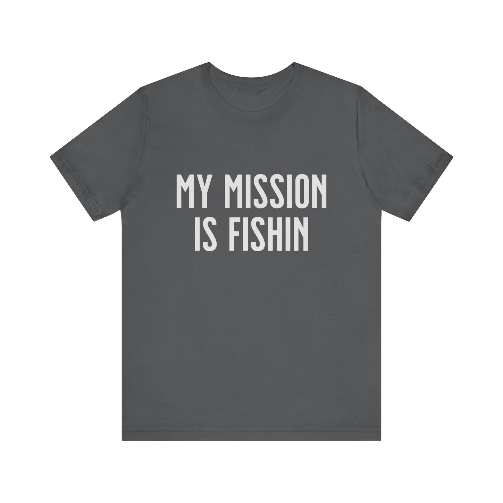 This T-Shirt features a simple text design that reads 'My Mission Is Fishin'. It gives off a casual and laid-back vibe, perfect for fishing enthusiasts looking for a comfortable and stylish top to wear. Ideal for casual outings, fishing trips, beach vacations, and Father's Day gifts.