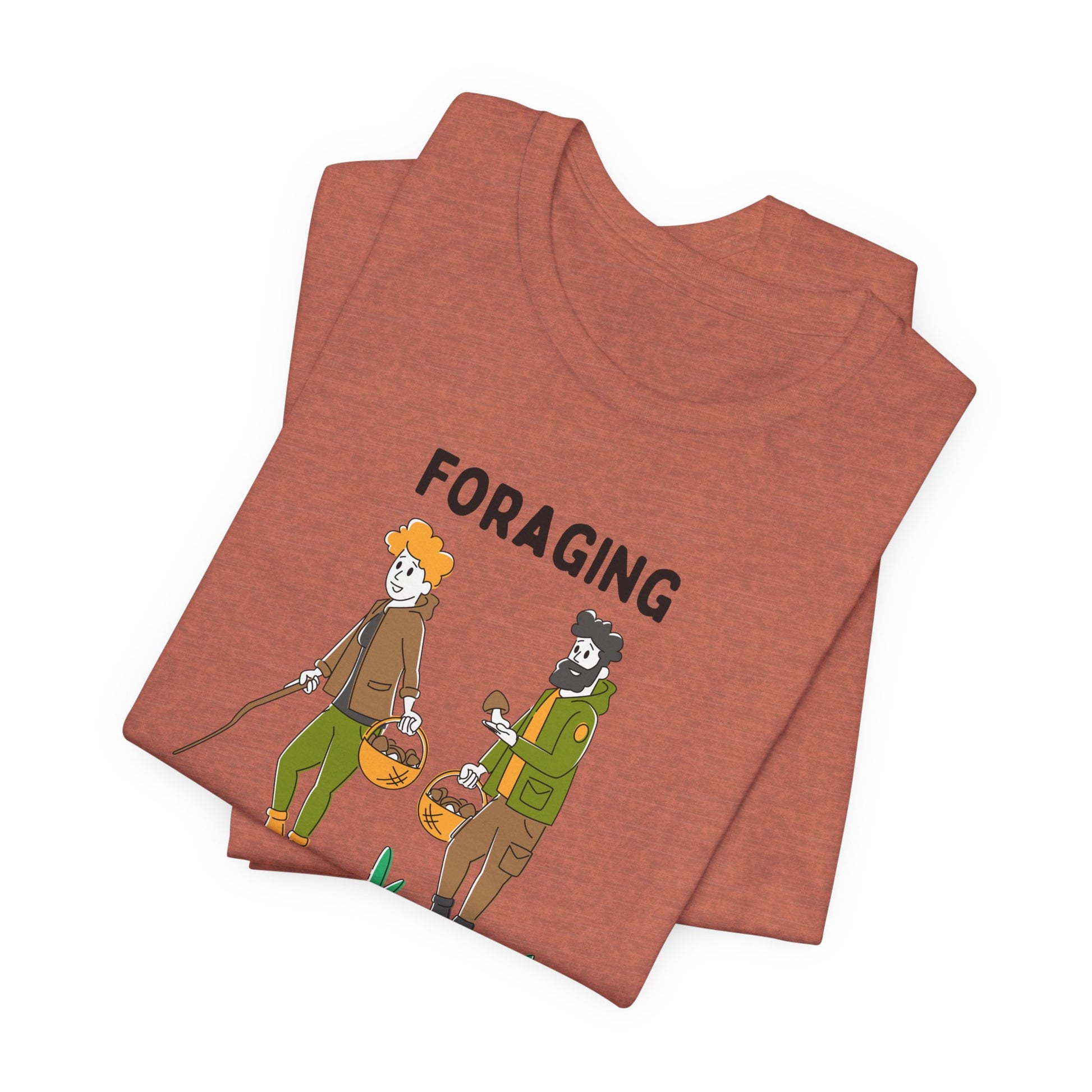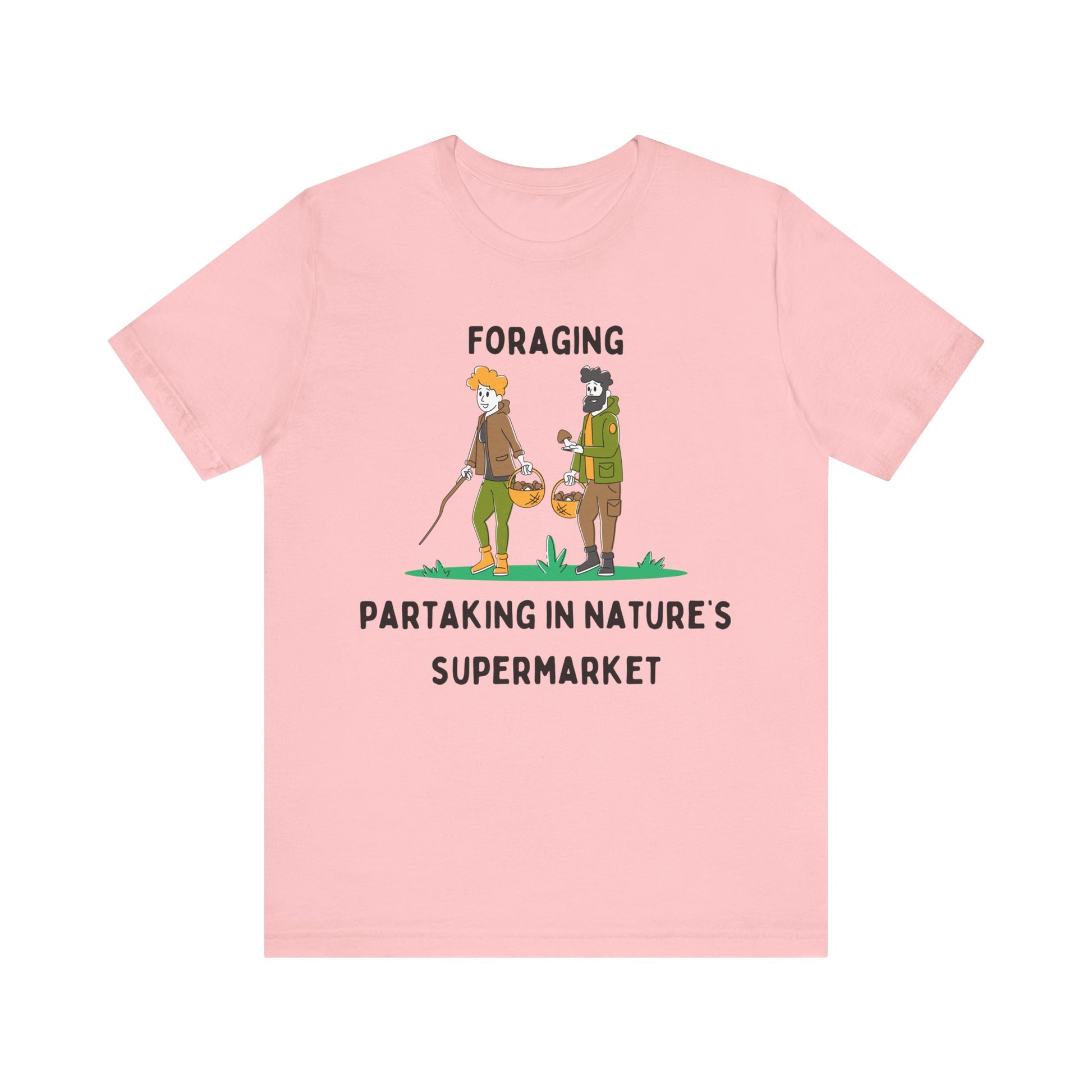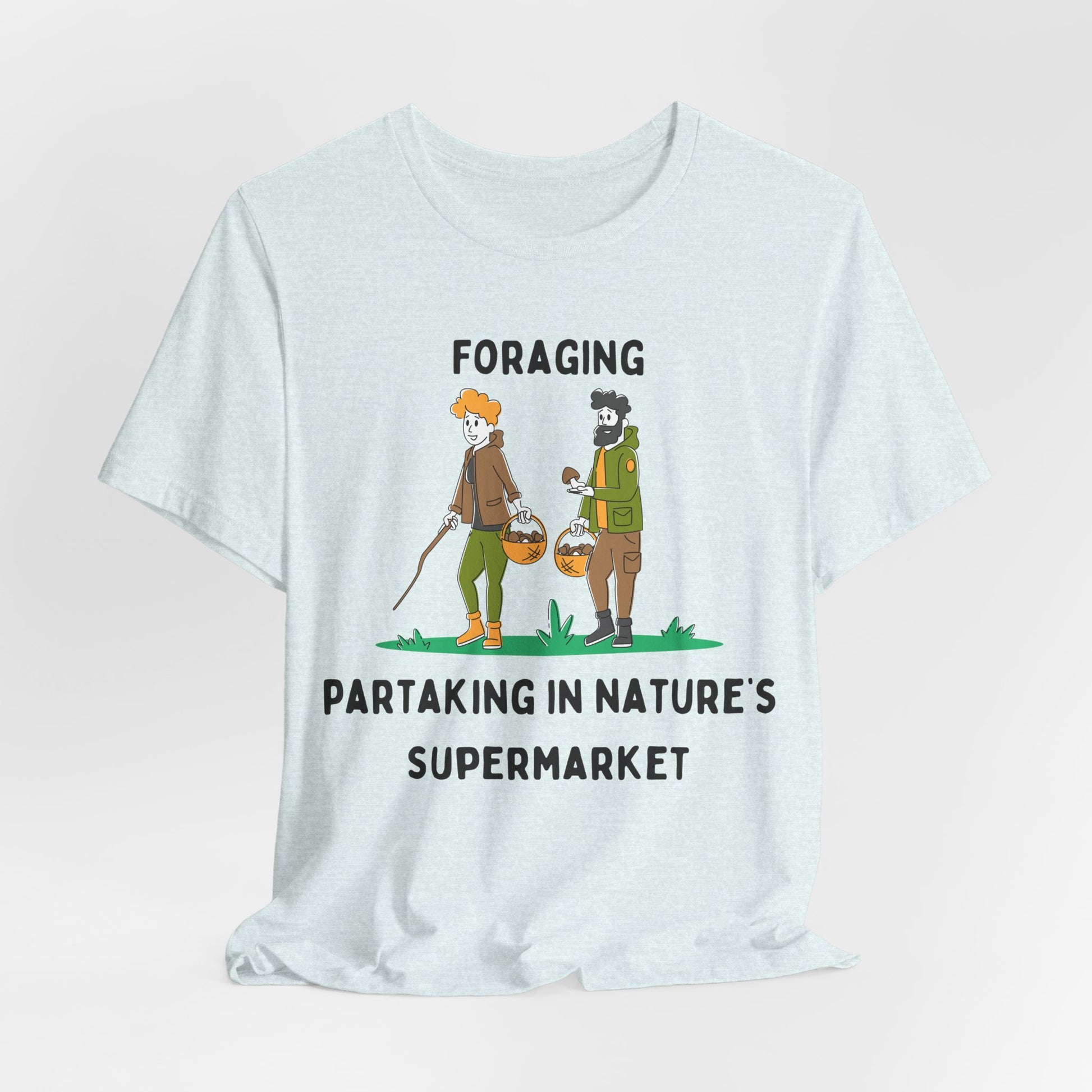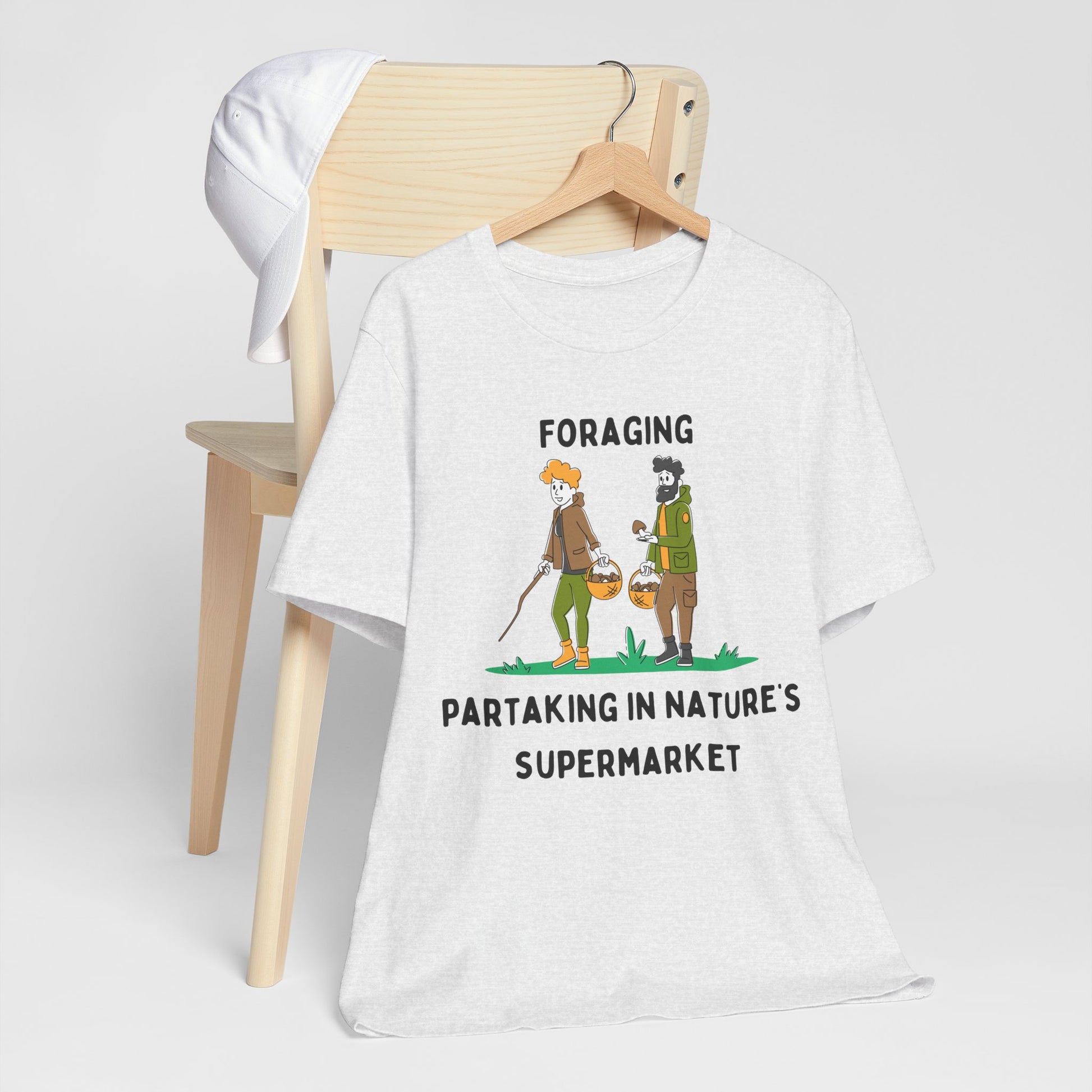 A comfortable and stylish t-shirt featuring a graphic of people out foraging with the quote 'Foraging partaking in nature's supermarket'. Perfect for nature lovers and those who enjoy outdoor activities. This tee can be worn casually or dressed up for semi-formal occasions. Ideal for Earth Day, Arbor Day, or any nature-related celebrations.