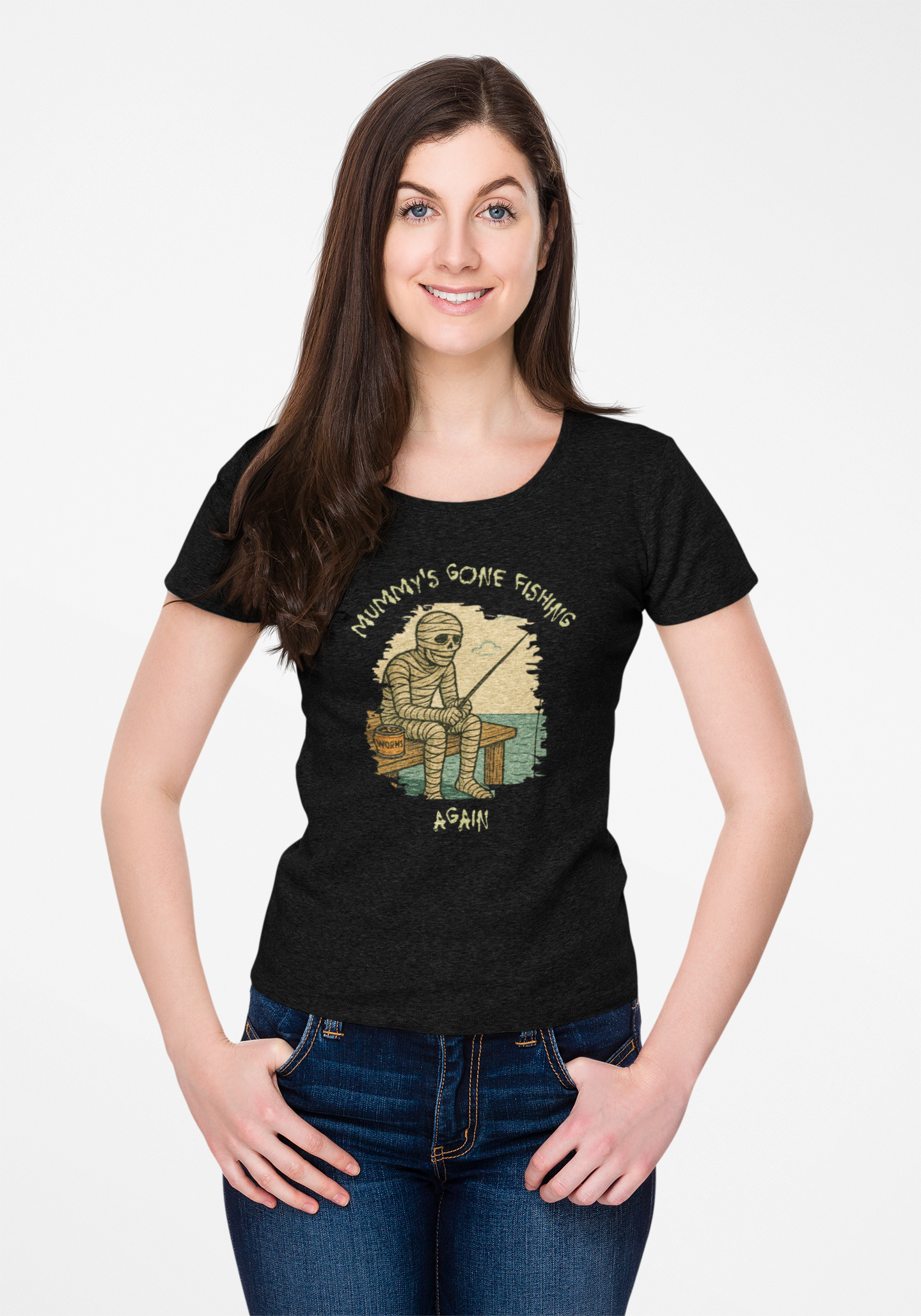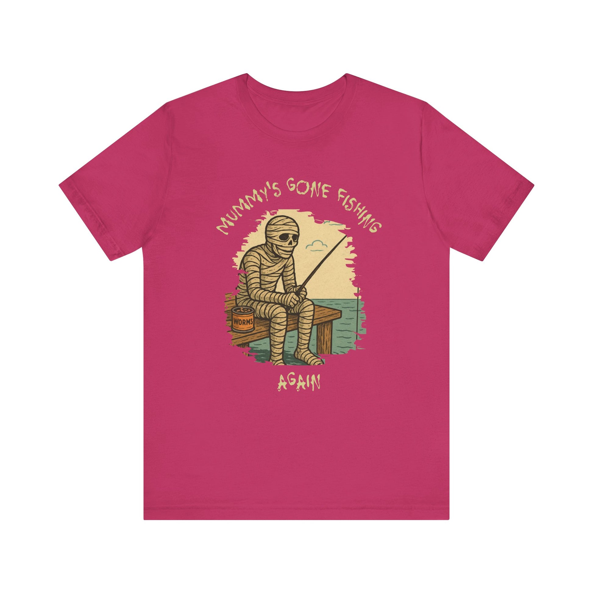 Hook the perfect catch of spooky humor with this Funny Mummy Fishing T-Shirt! Designed for anglers who love Halloween, this graphic tee shows a mummy sitting on an old dock with a fishing pole and a can of worms—mixing creepy charm with fishing life.