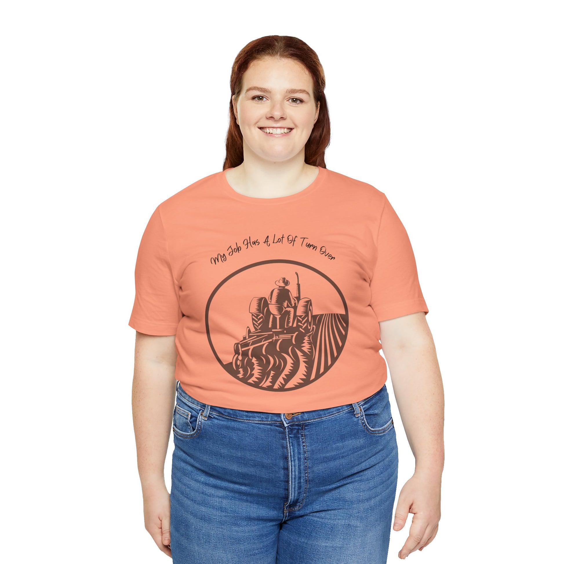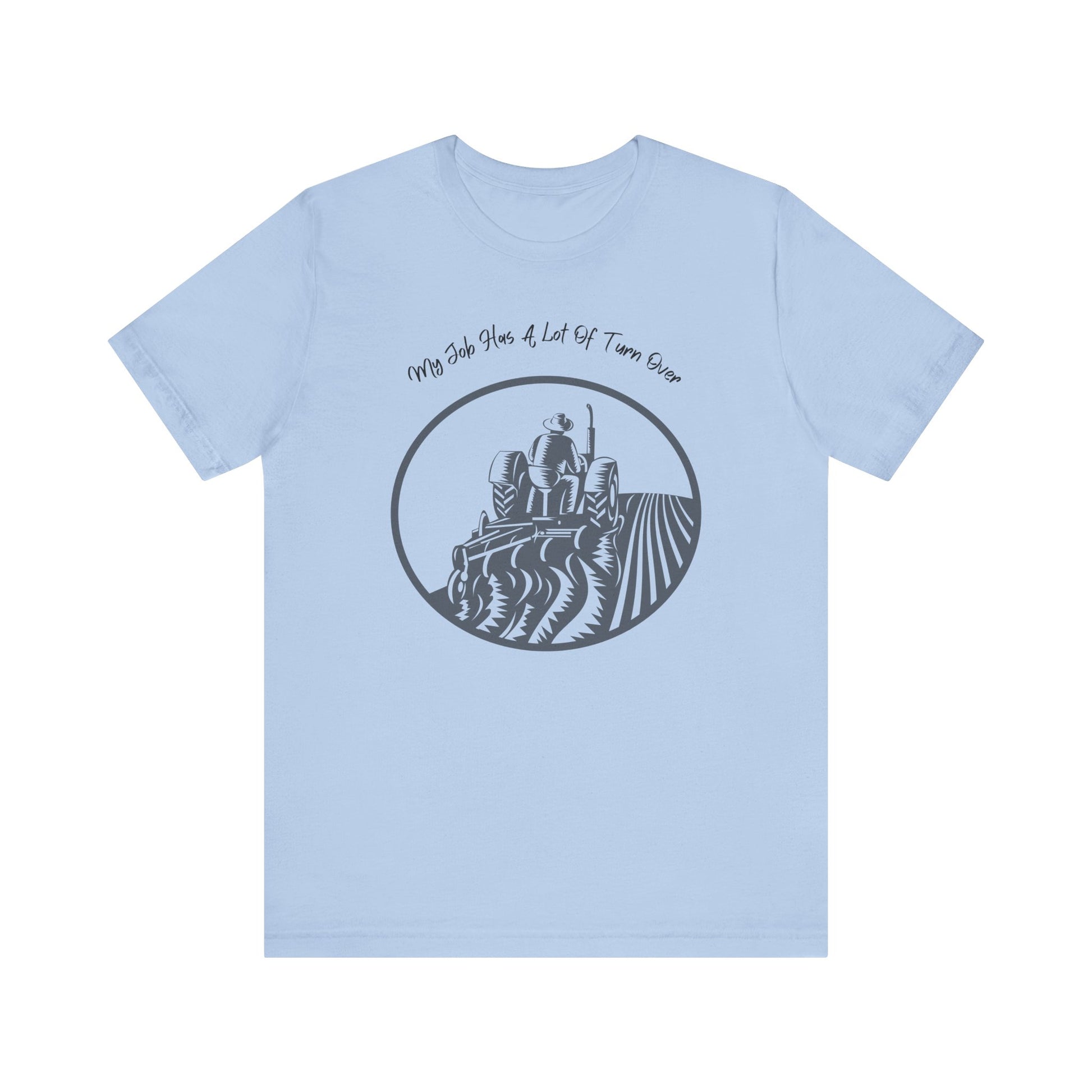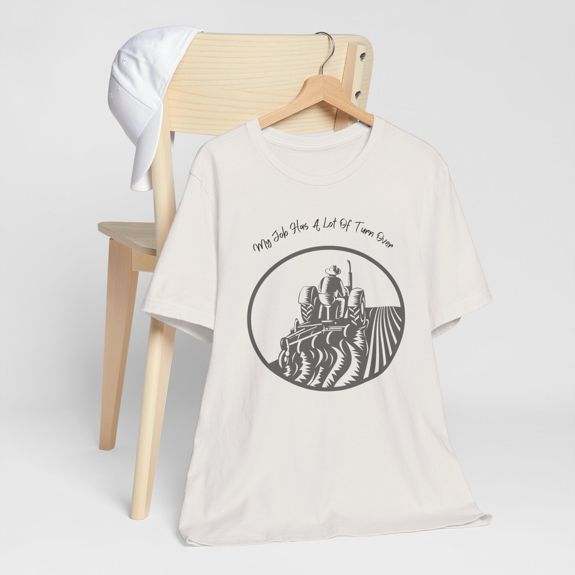 A comfortable unisex jersey short sleeve tee featuring a graphic of a person on a tractor plowing a field with a text that reads 'My Job Has A Lot Of Turn Over'. The design gives a rural and hardworking vibe, perfect for farmers, agricultural workers, or those who appreciate farming. Ideal for casual wear or as a gift for National Farmers Day or Labor Day.