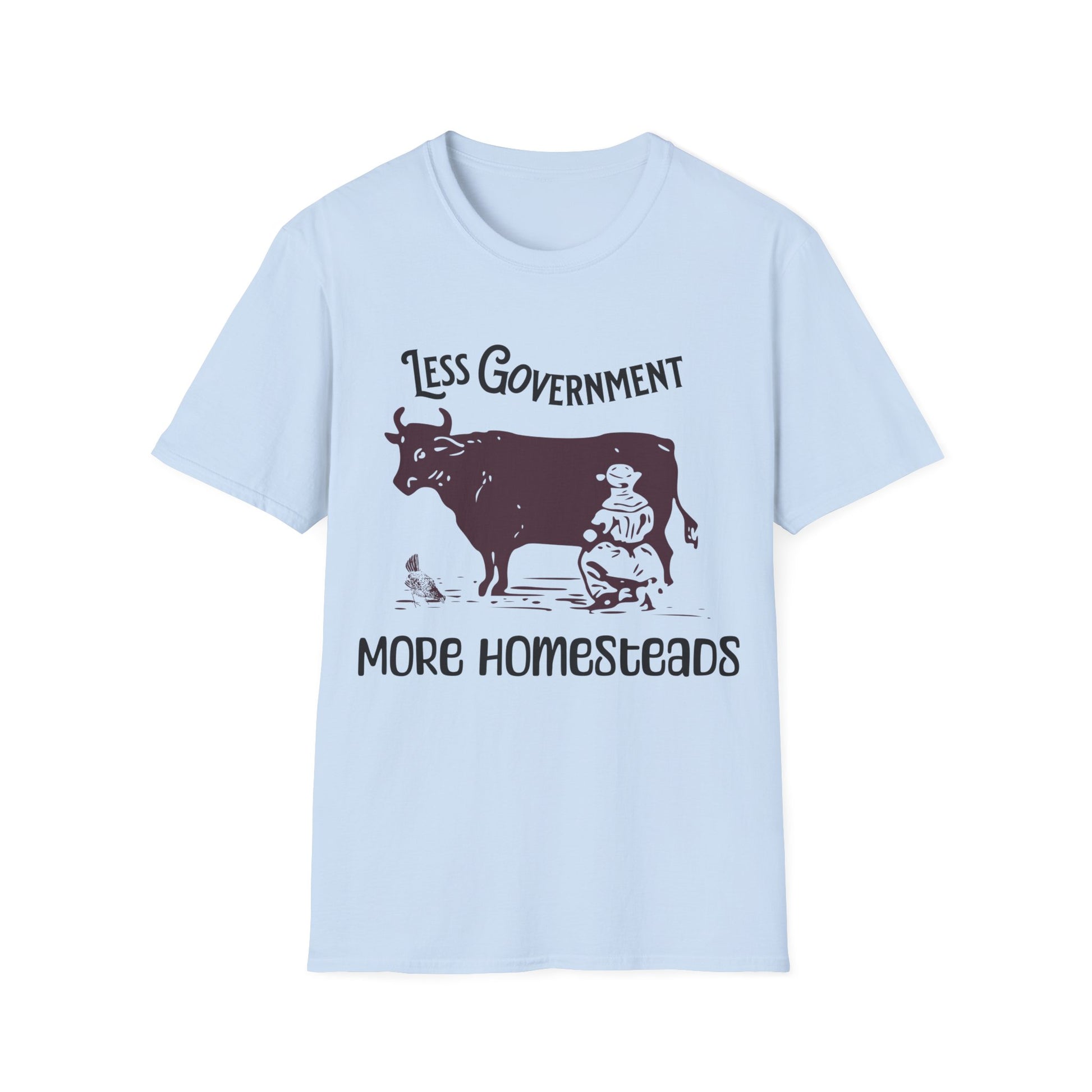 A unisex softstyle t-shirt featuring a graphic of a lady milking a cow with a caption that reads 'less government more homesteads'. This t-shirt is perfect for anyone looking for a comfortable and versatile piece with a touch of humor and homestead vibes. It can be worn casually or dressed up for various occasions.