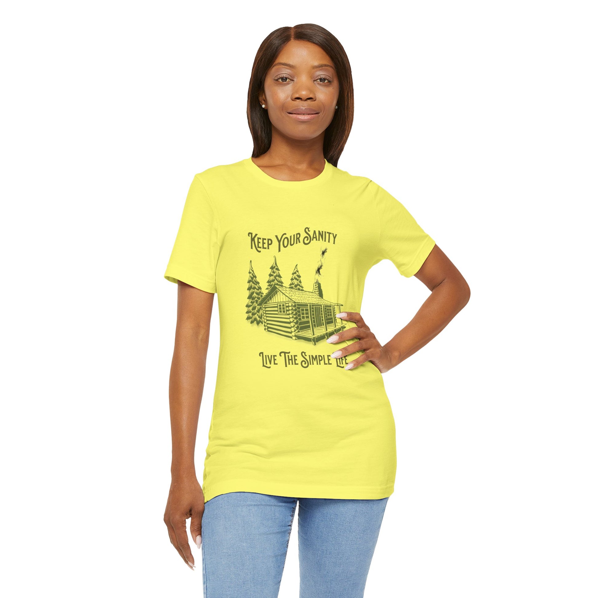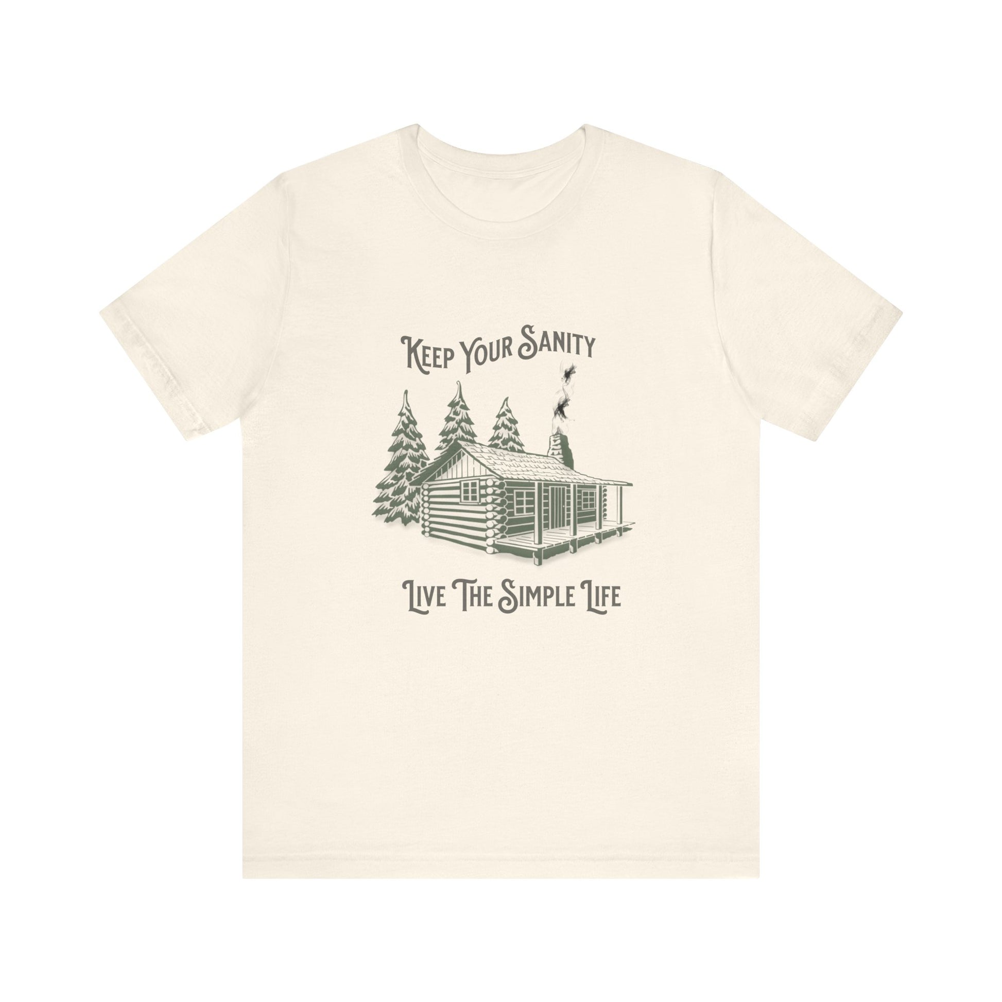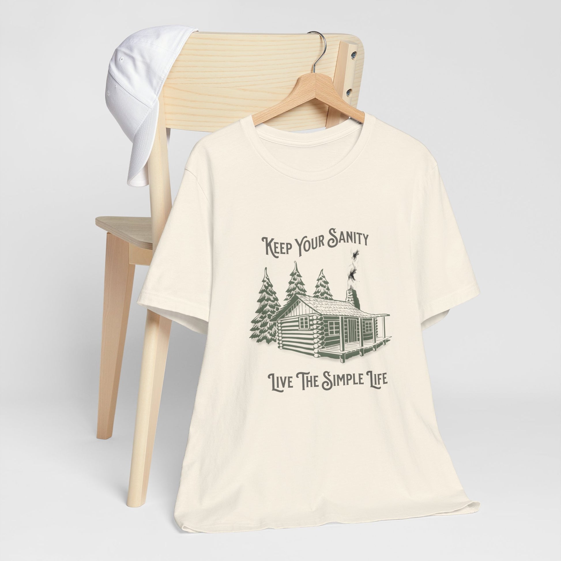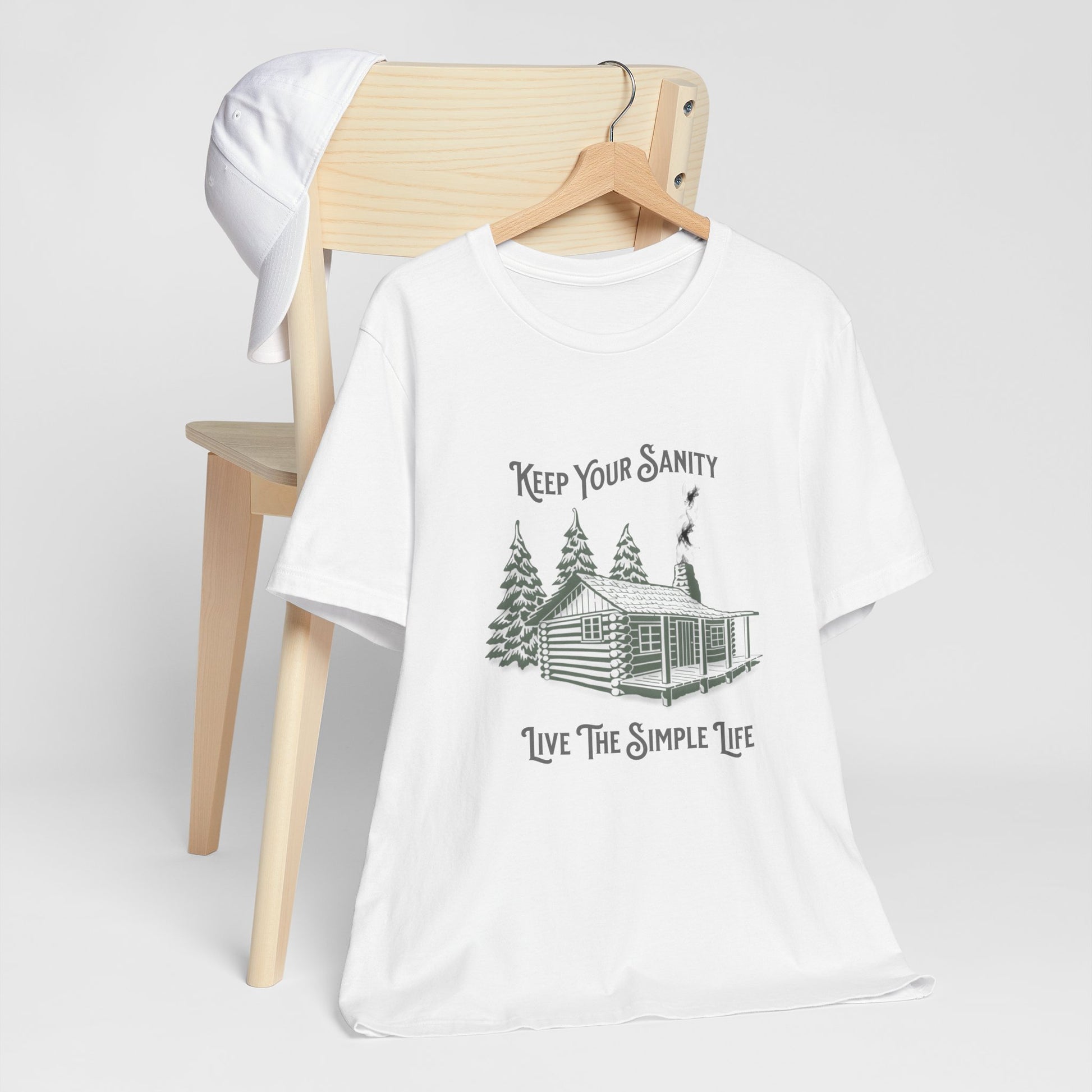 A graphic T-Shirt featuring a log house in the woods with the text 'Keep Your Sanity Live The Simple Life.' Gives off a cozy and rustic vibe, perfect for nature lovers and those who seek simplicity in life. Ideal for everyday wear, outdoor adventures, and camping trips, as well as a thoughtful gift for Earth Day, Arbor Day, or any nature-related occasion.