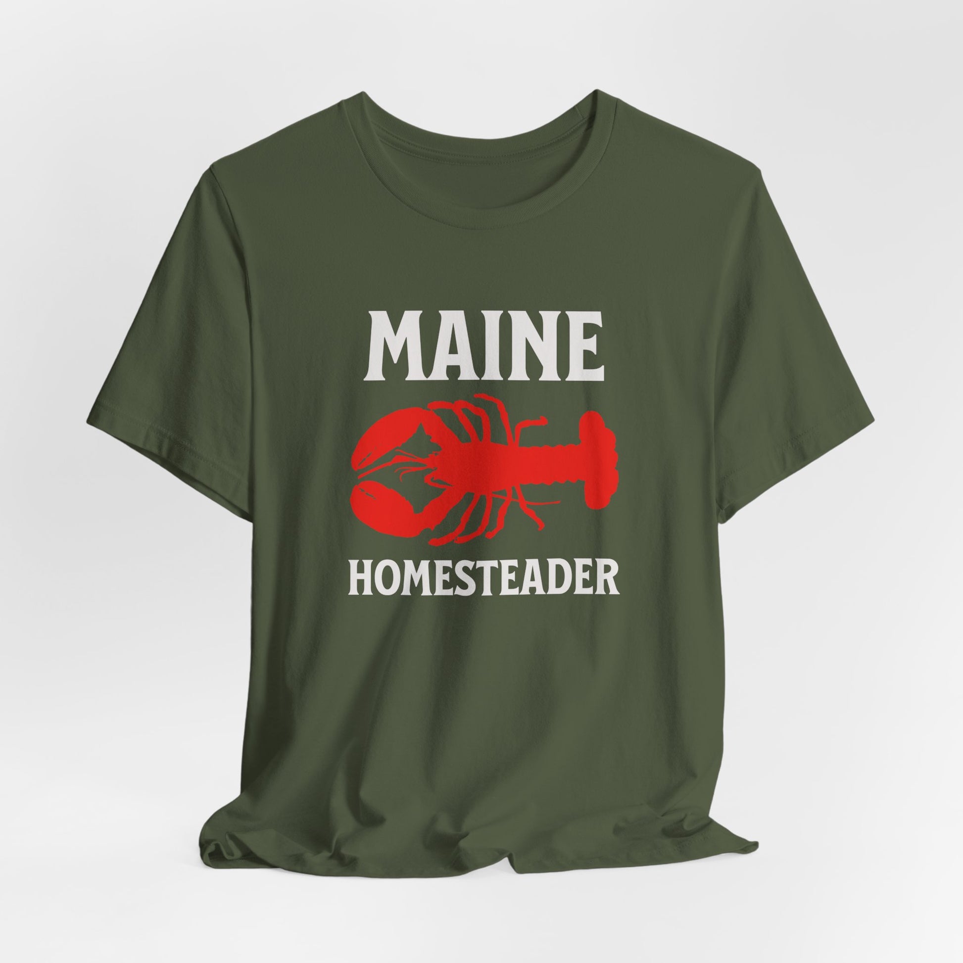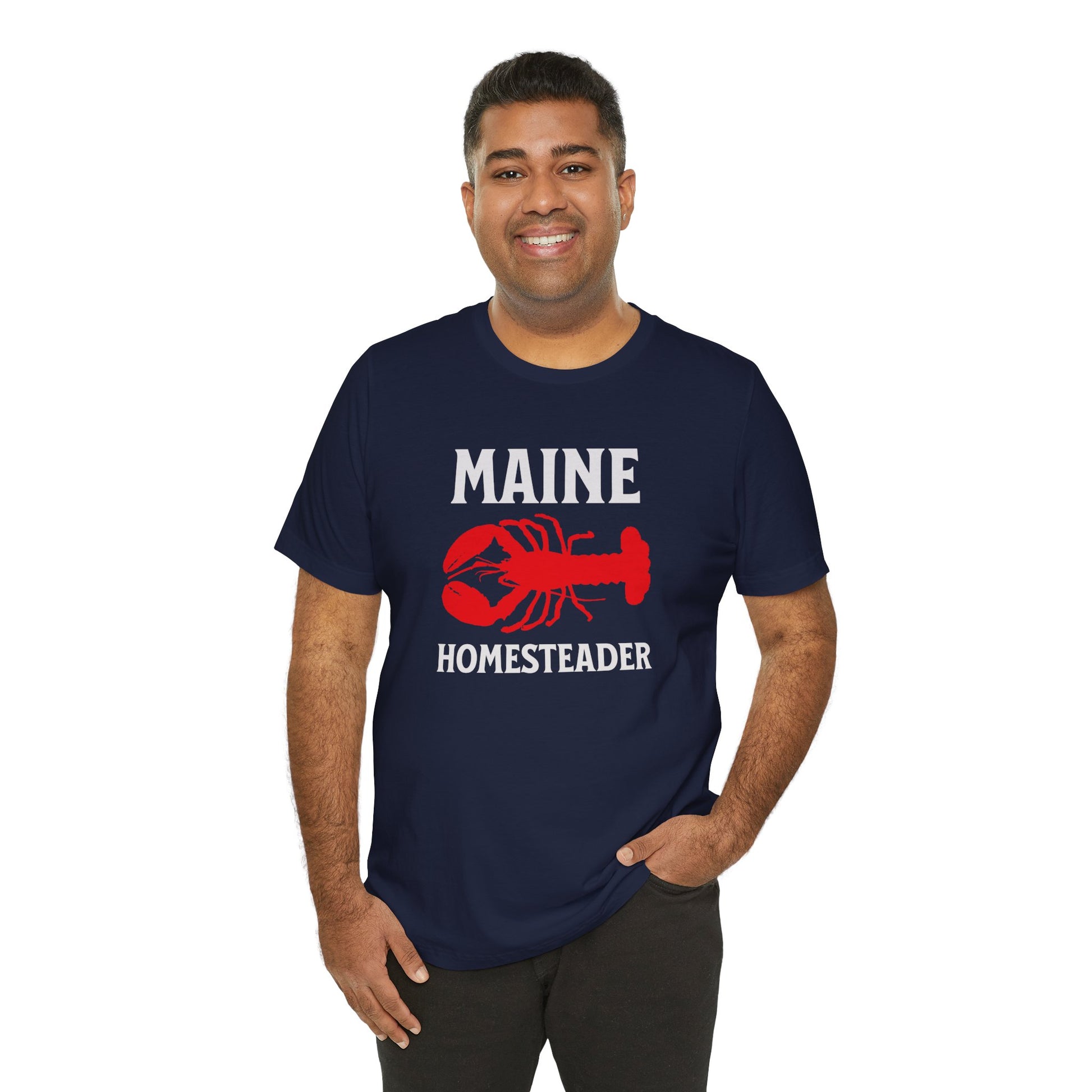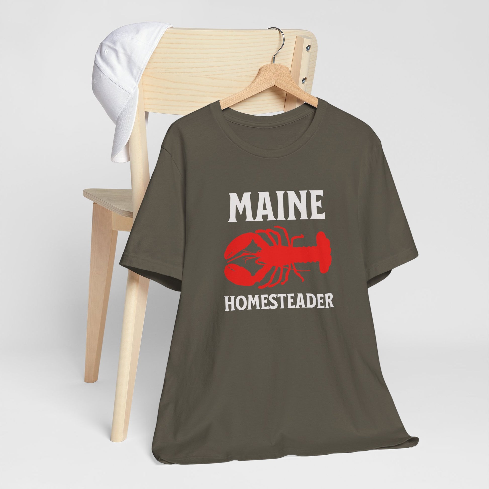 A comfortable and casual T-shirt featuring a graphic of a red lobster with the text 'Maine' and 'homesteader'. Perfect for those who love coastal vibes and want to show their love for Maine. Ideal for casual wear and a great gift for lobster lovers or those with a connection to Maine.