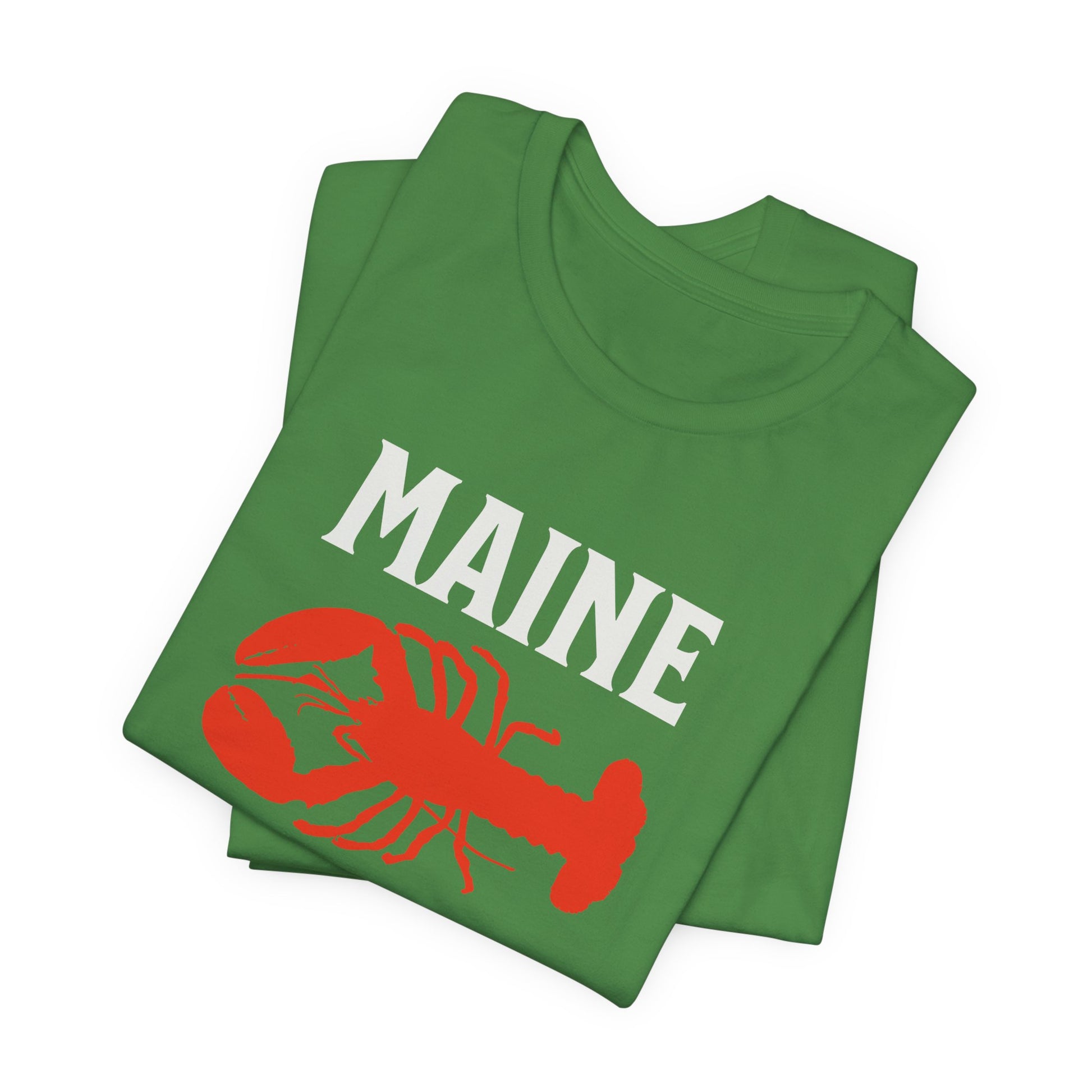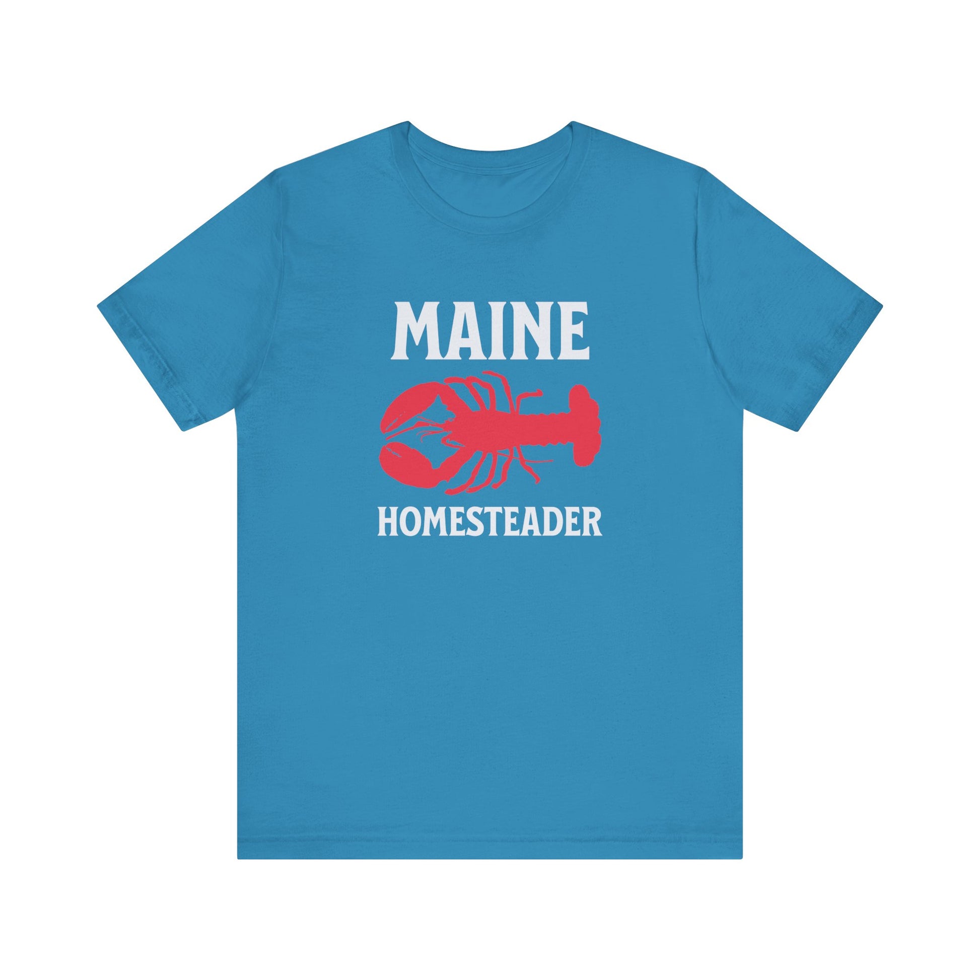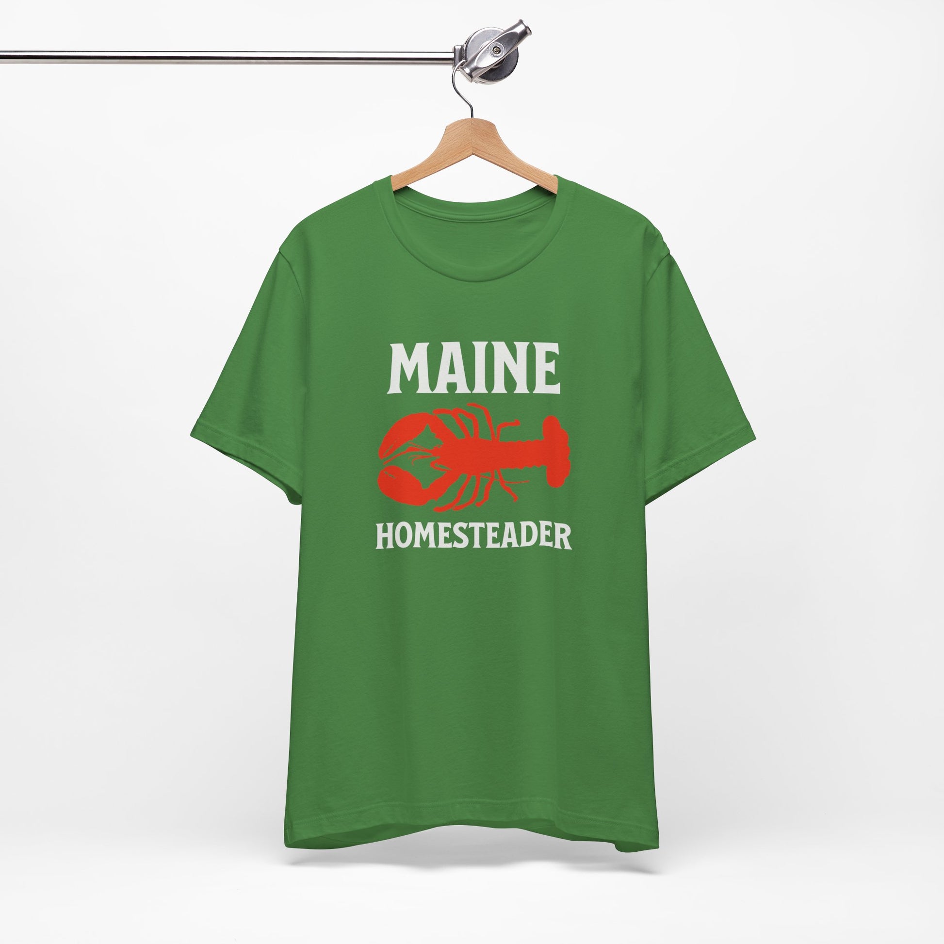 A comfortable and casual T-shirt featuring a graphic of a red lobster with the text 'Maine' and 'homesteader'. Perfect for those who love coastal vibes and want to show their love for Maine. Ideal for casual wear and a great gift for lobster lovers or those with a connection to Maine.