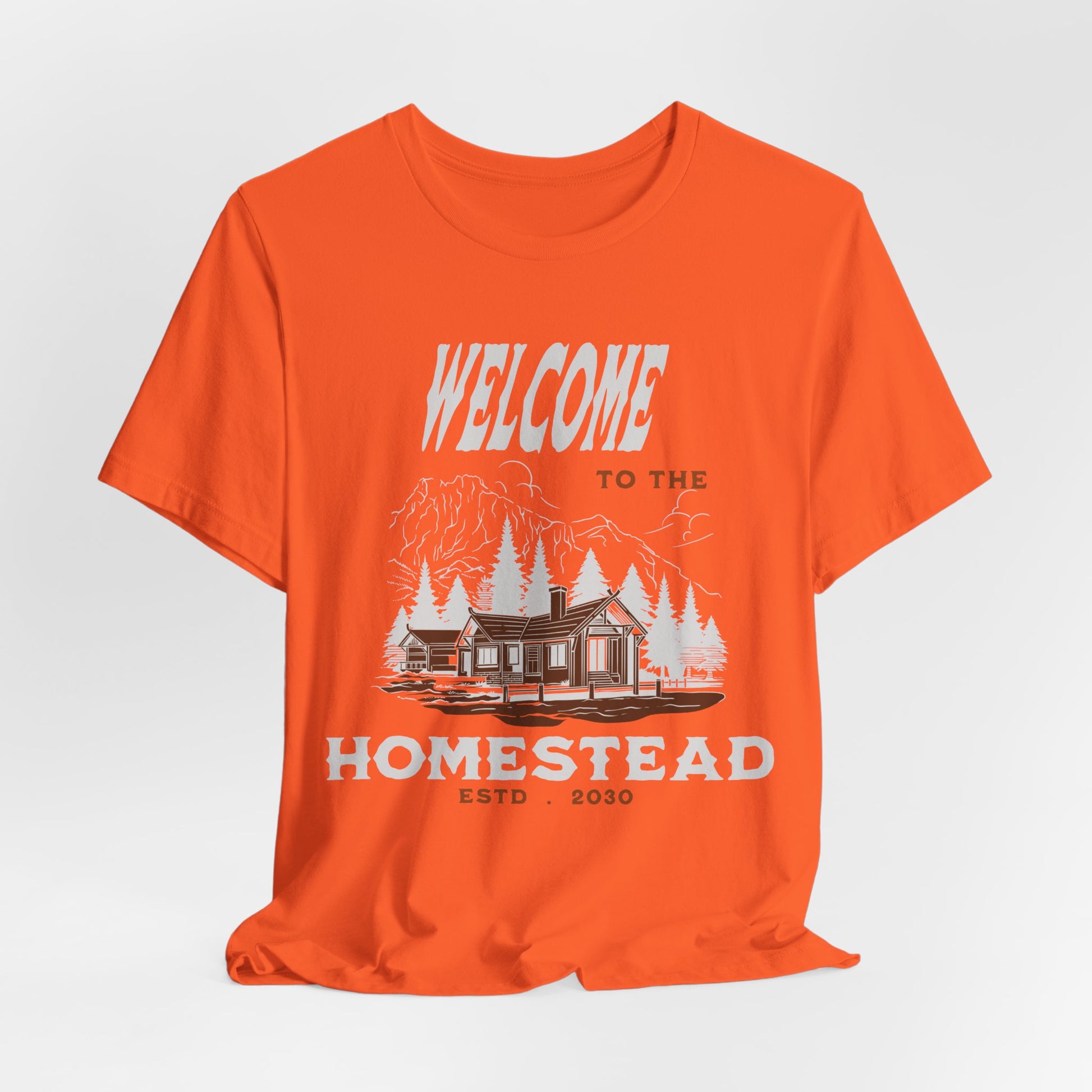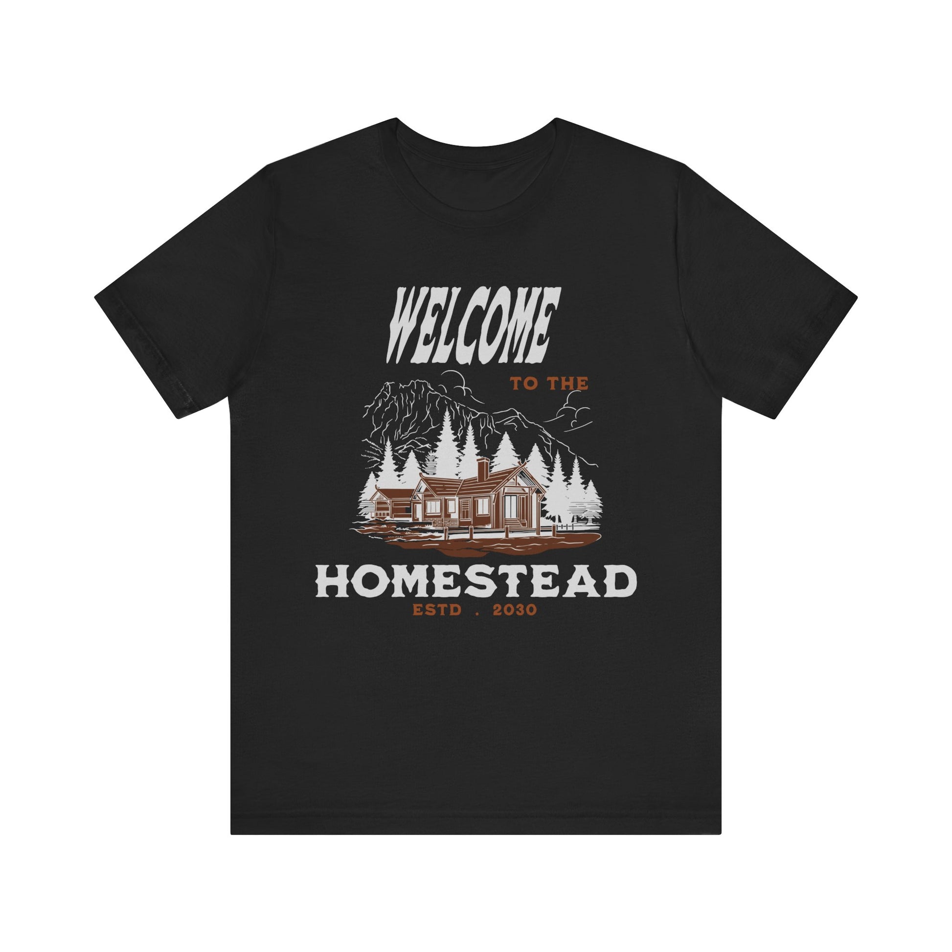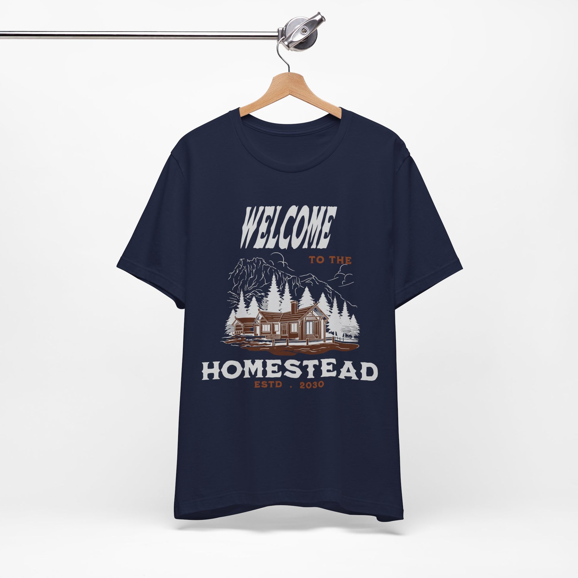 A comfortable unisex jersey short sleeve tee featuring a graphic of a cabin in front of mountains with text that reads "welcome to the homestead". This tee gives off a cozy and rustic vibe, perfect for outdoor enthusiasts or those who enjoy a cabin lifestyle. Ideal for everyday wear or as a casual statement piece. Great for nature lovers, adventurers, and those who appreciate the simple joys of life.