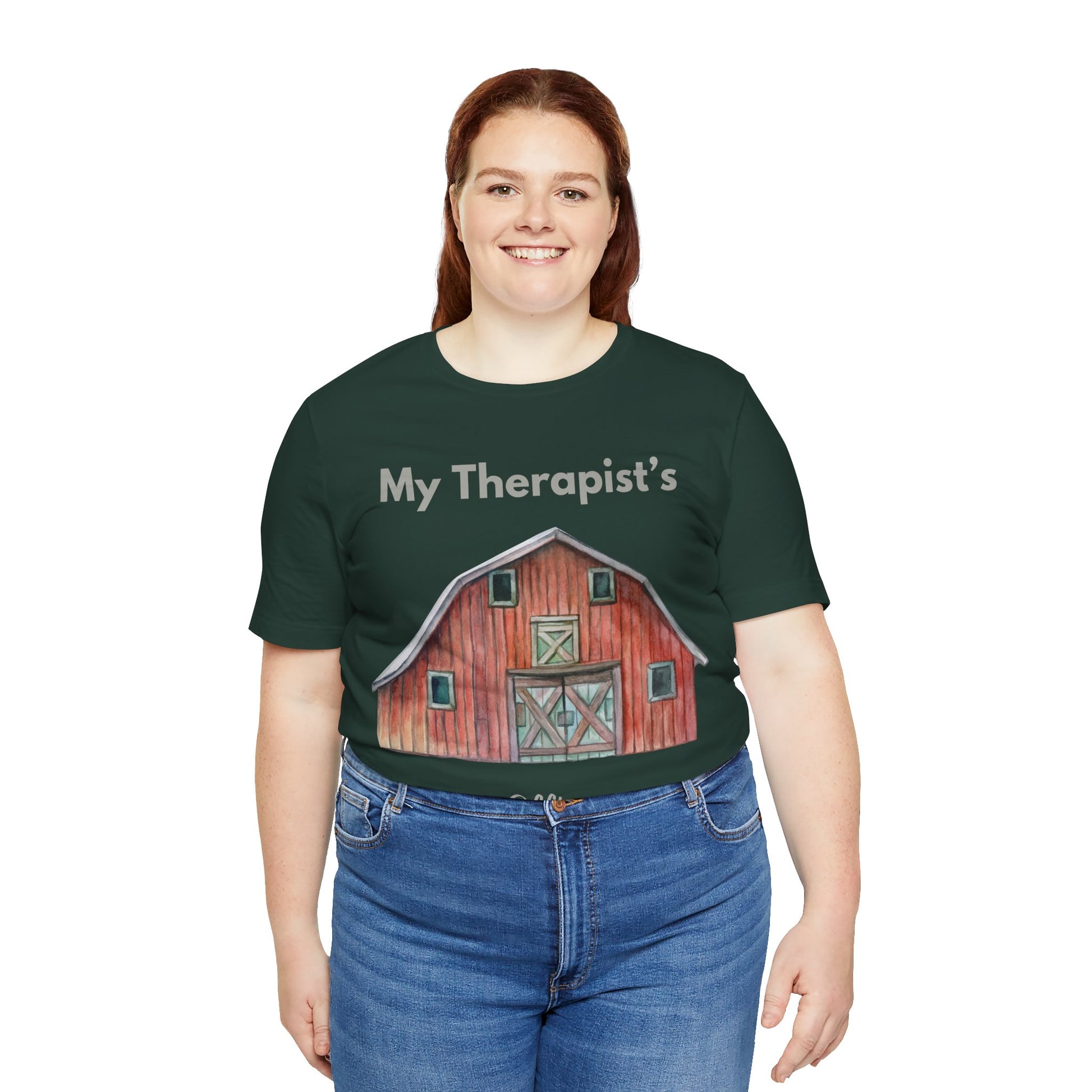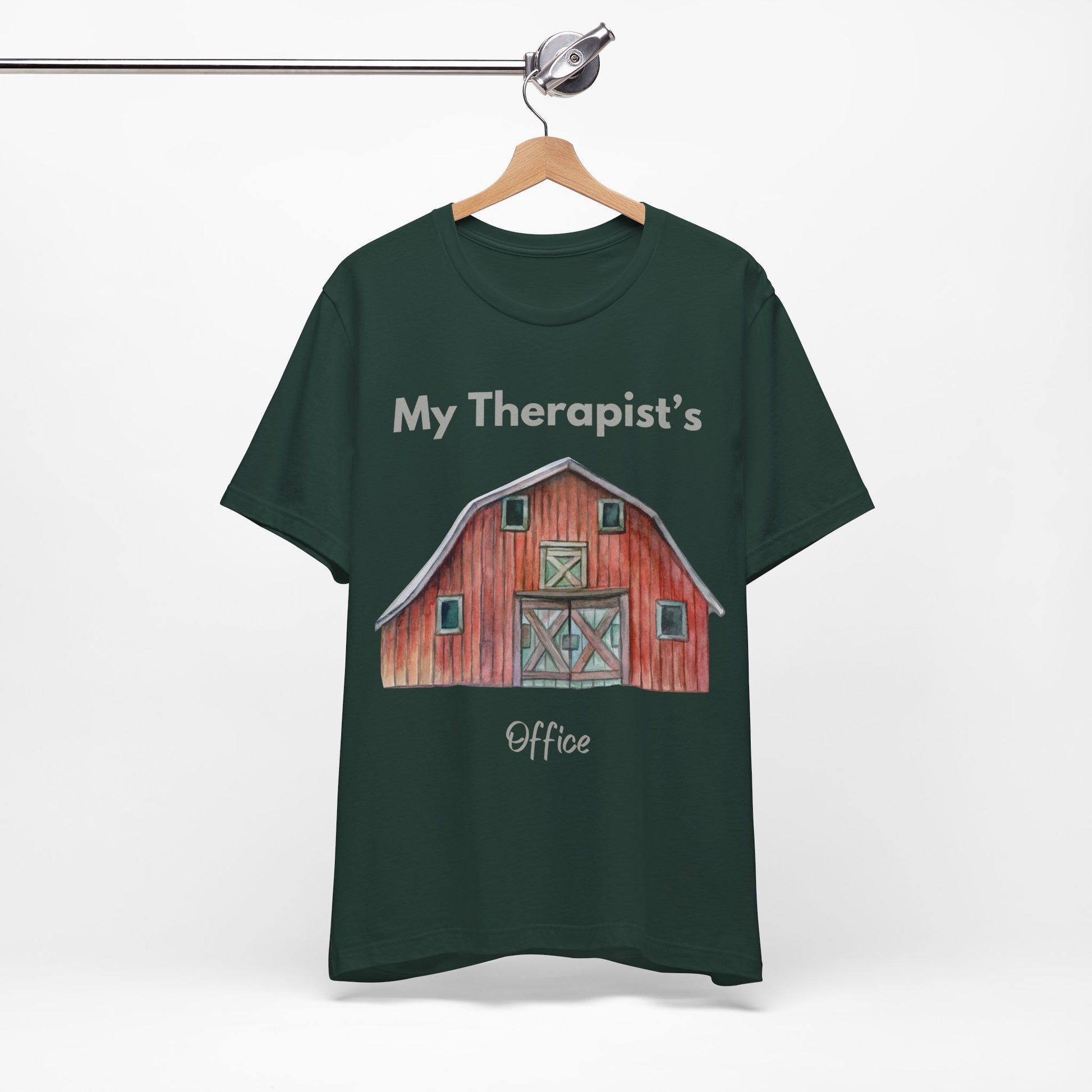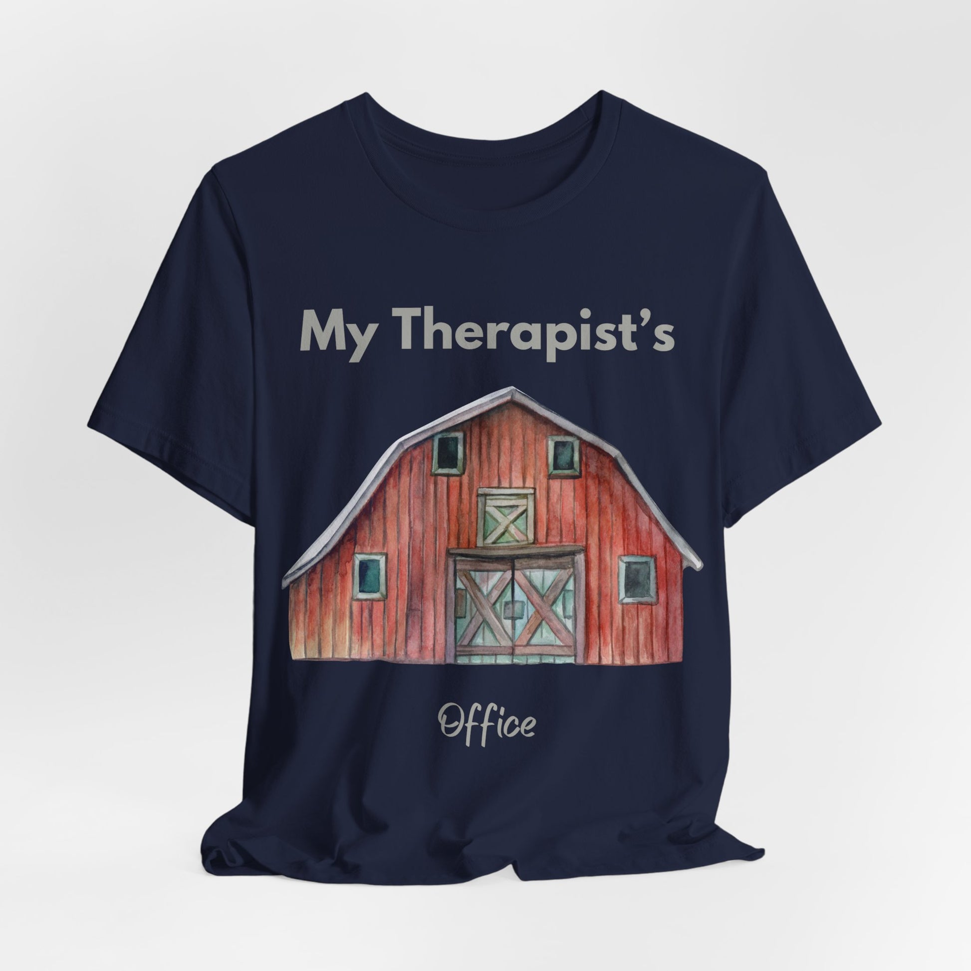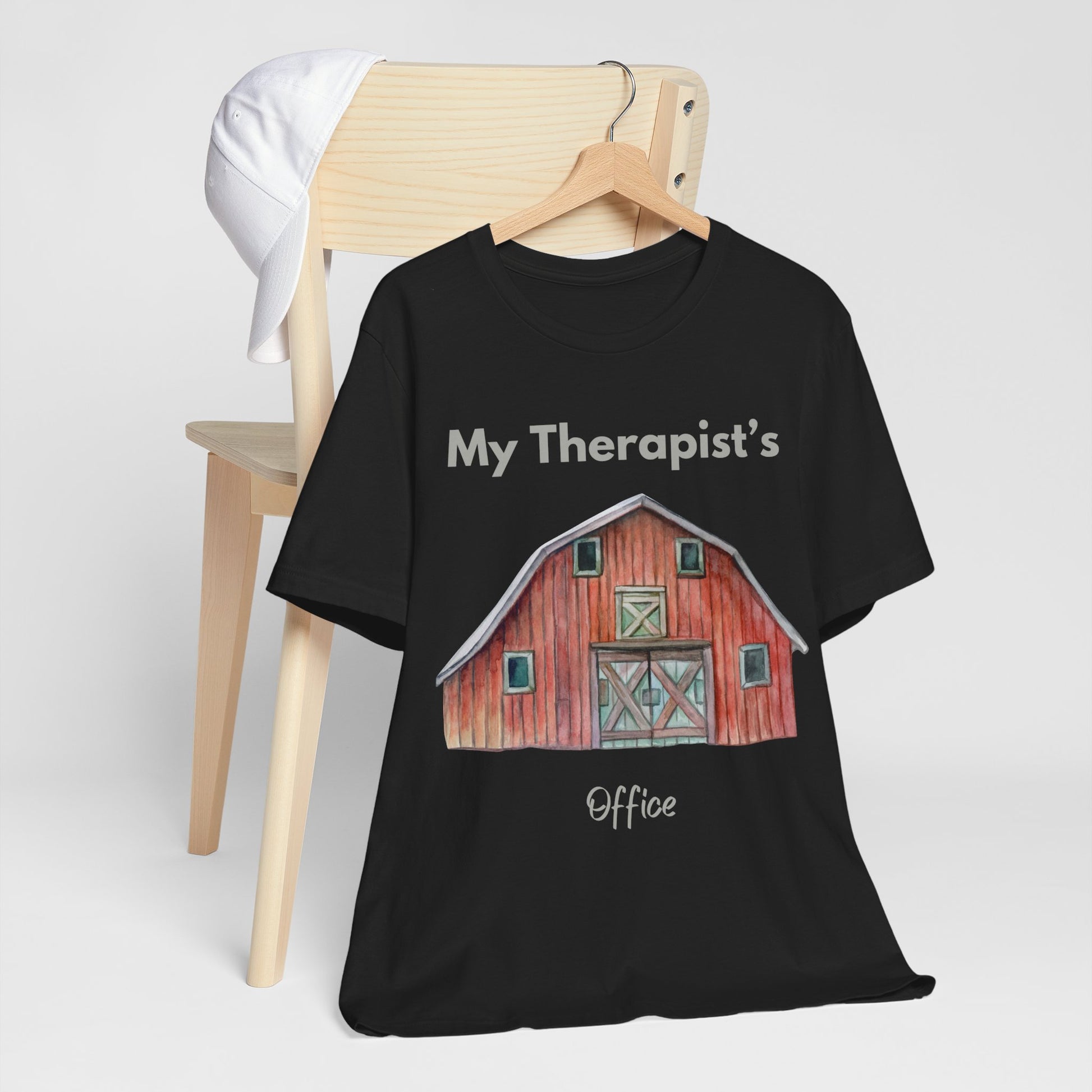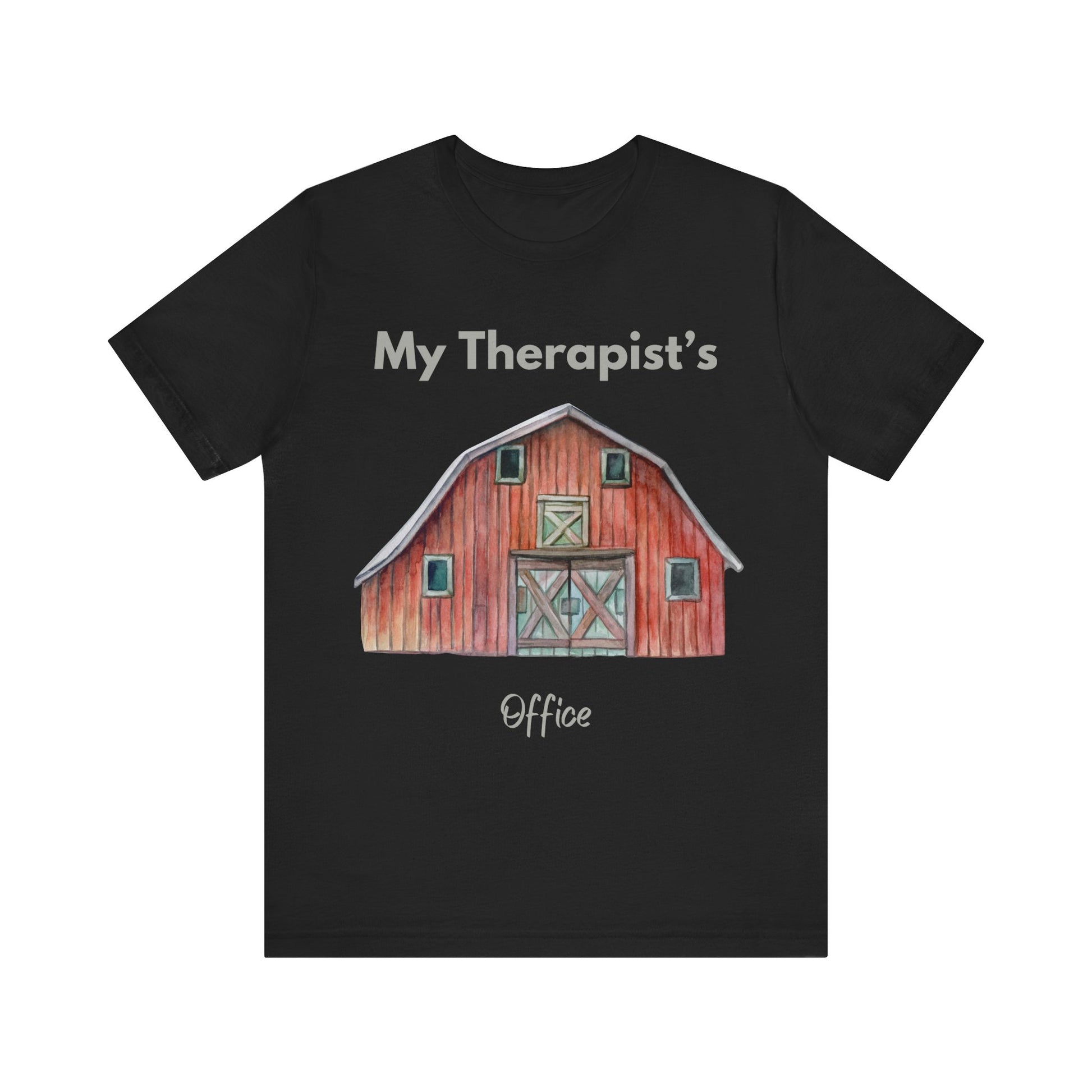 This t-shirt features a graphic of a red barn with text that reads "my therapist's office". It has a relaxed fit and is made with 100% lightweight cotton, making it perfect for everyday wear. The design adds a touch of humor and whimsy to your outfit, making it a great conversation starter. Ideal for those who appreciate quirky, unique designs and want to add a fun element to their wardrobe. Perfect for casual wear, lounging at home, or a laid-back day out with friends. Great gift for therapists, mental health professionals, or anyone with a sense of humor.