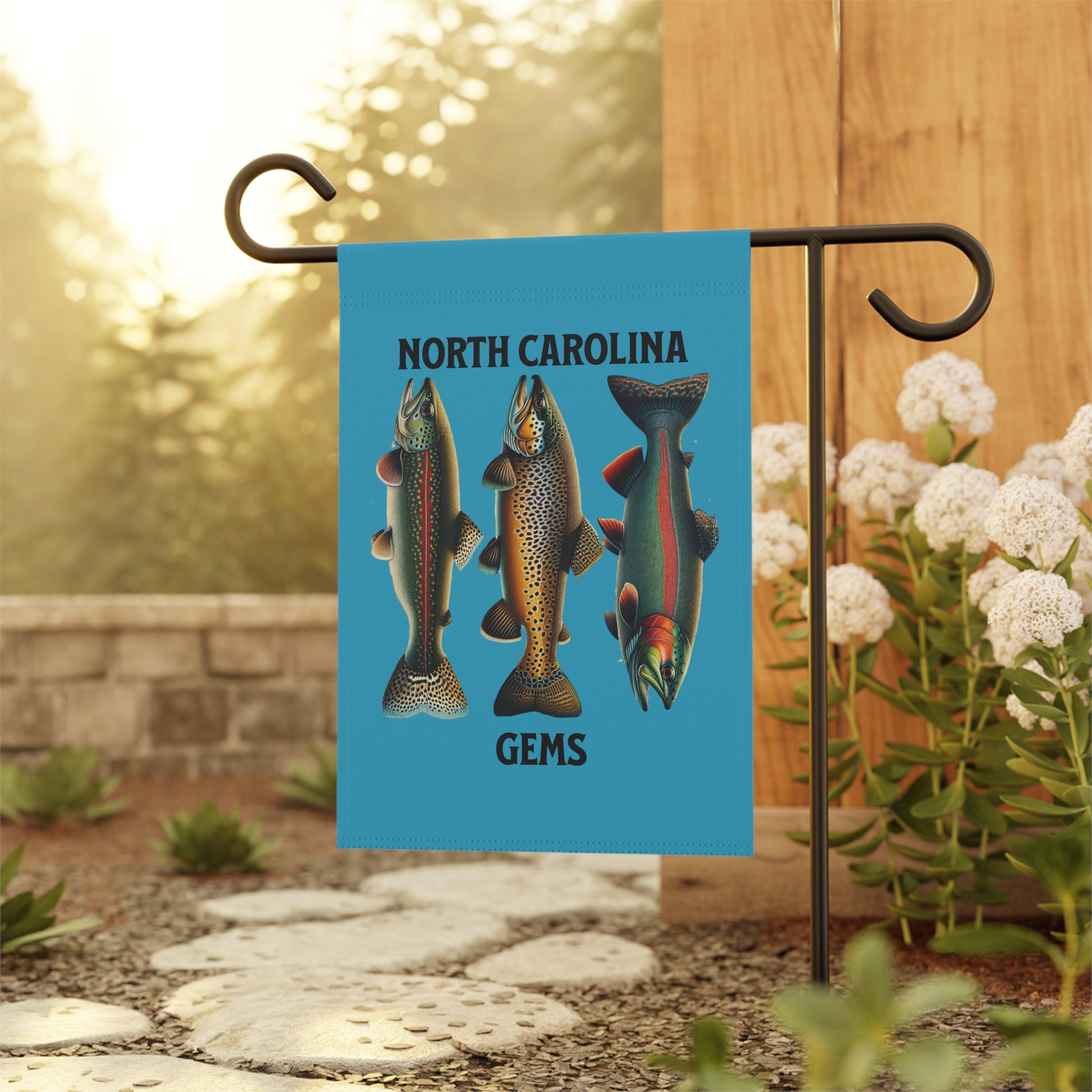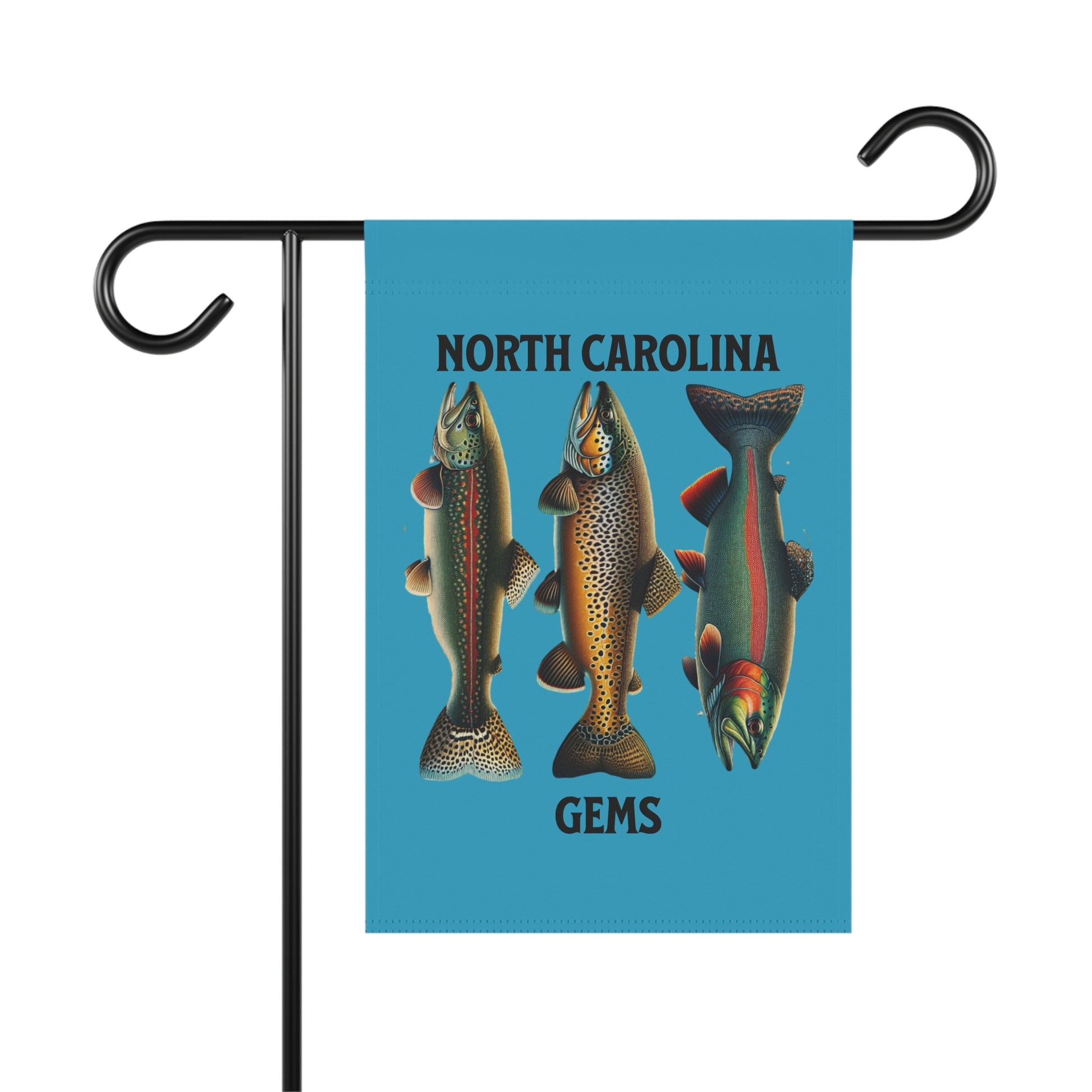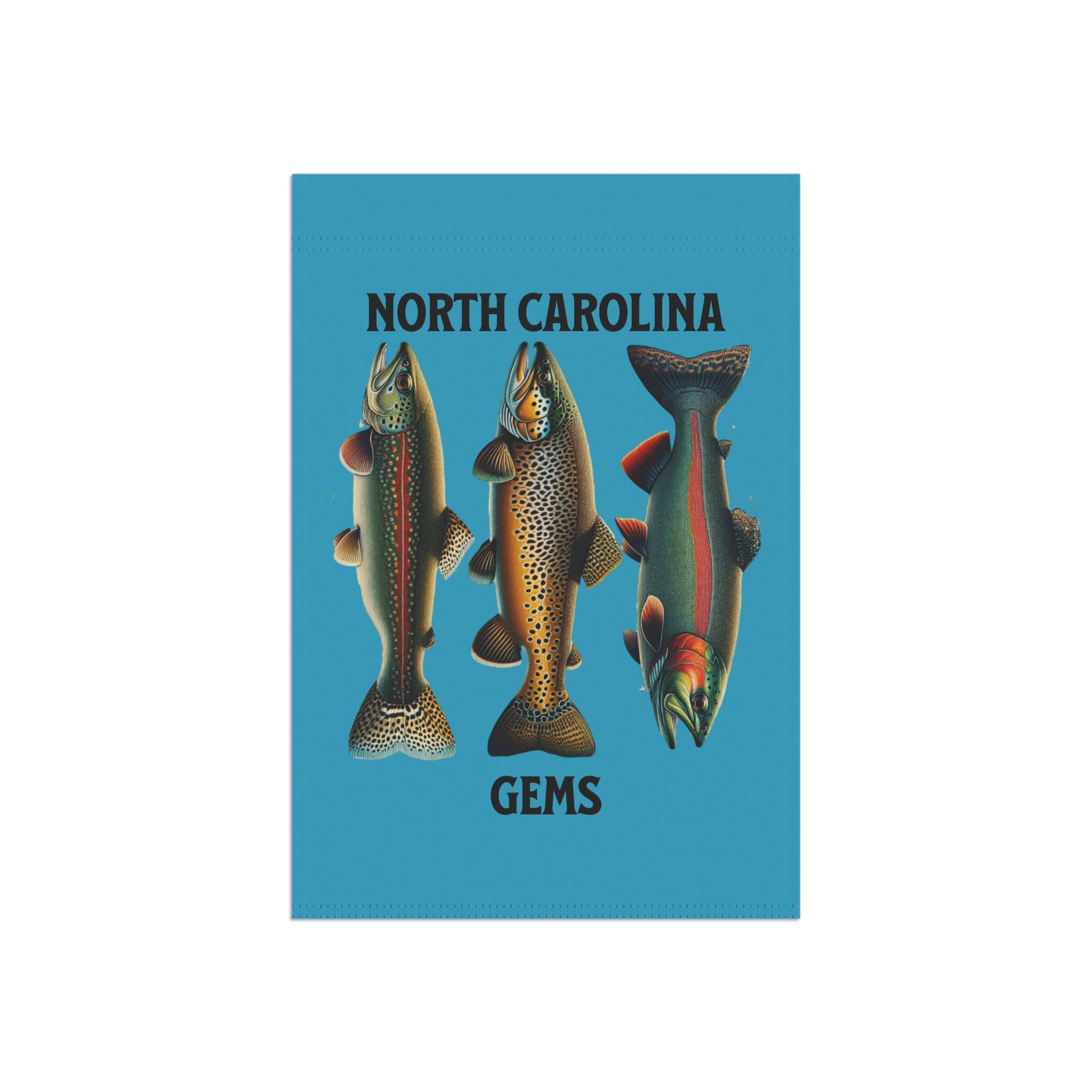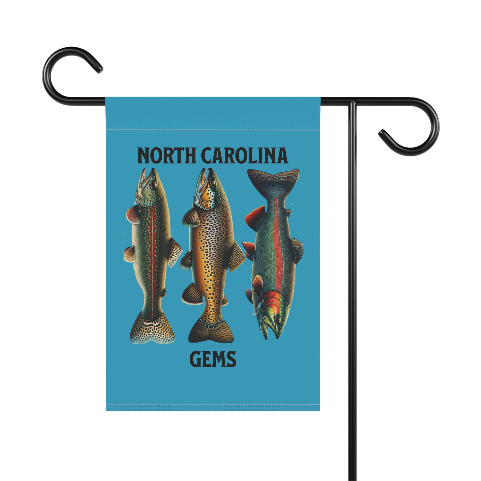 A yard banner featuring a graphic of a rainbow trout, brown trout, and brook trout with a text that reads 'North Carolina Gems'. Perfect for outdoor enthusiasts and fishing lovers, this banner adds a touch of natural beauty to your garden or house. Ideal for displaying during fishing season or as a decoration for a North Carolina-themed celebration.