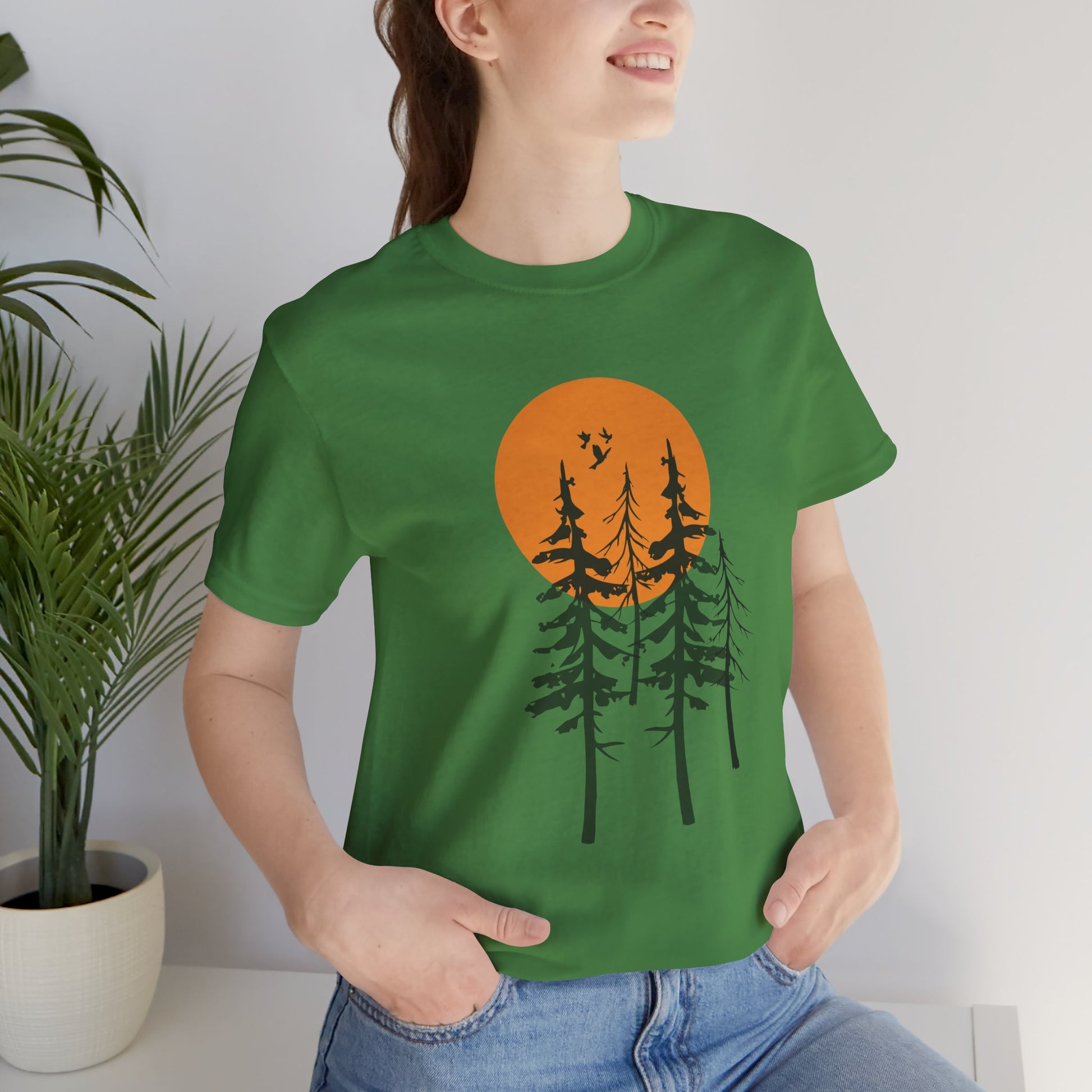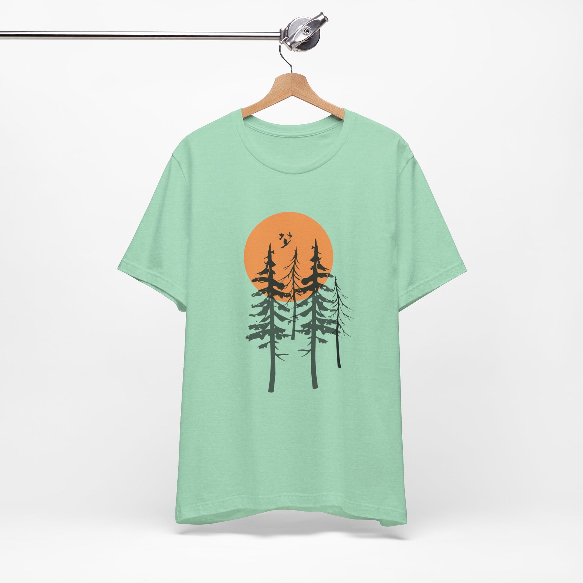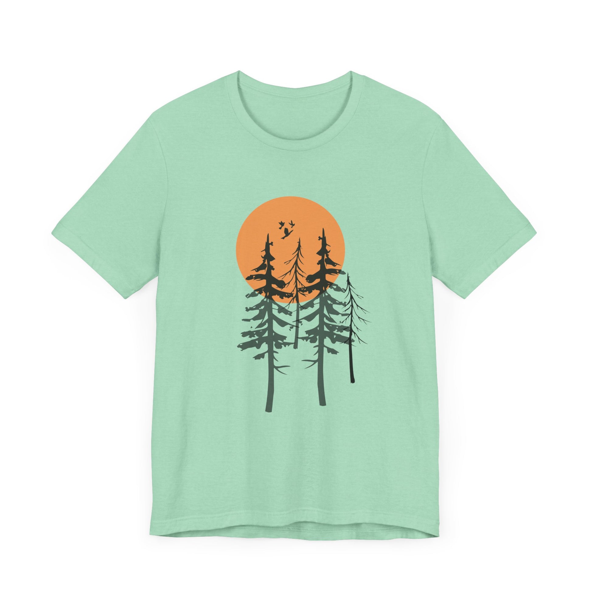 A graphic T-shirt featuring a sun rising behind some pine trees, giving off a serene and peaceful vibe. Perfect for nature lovers, outdoor enthusiasts, and those seeking a calm atmosphere. Ideal for wearing on outdoor adventures, camping trips, nature walks, or simply for a casual laid-back look. Relevant for Earth Day, Arbor Day, and nature-themed events.