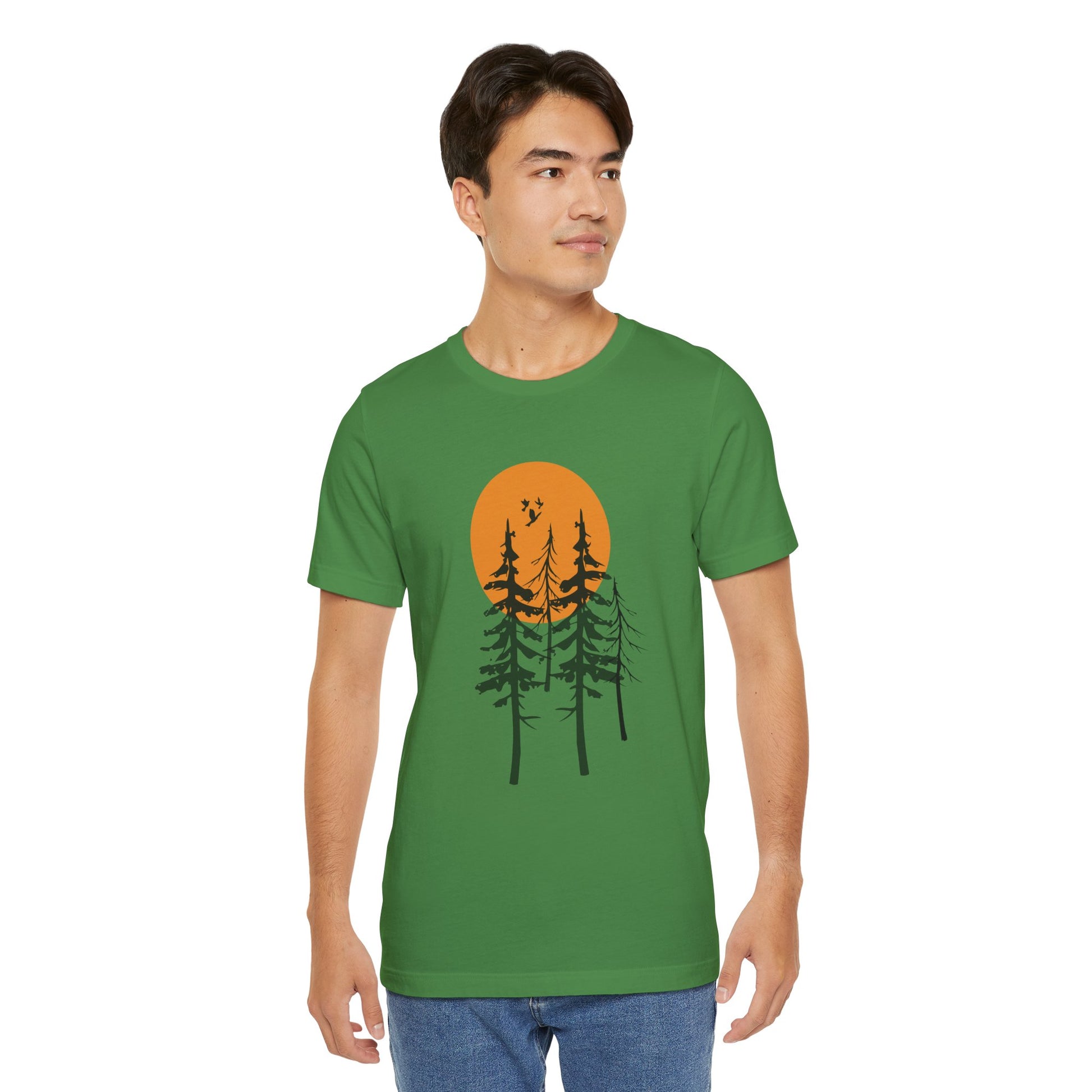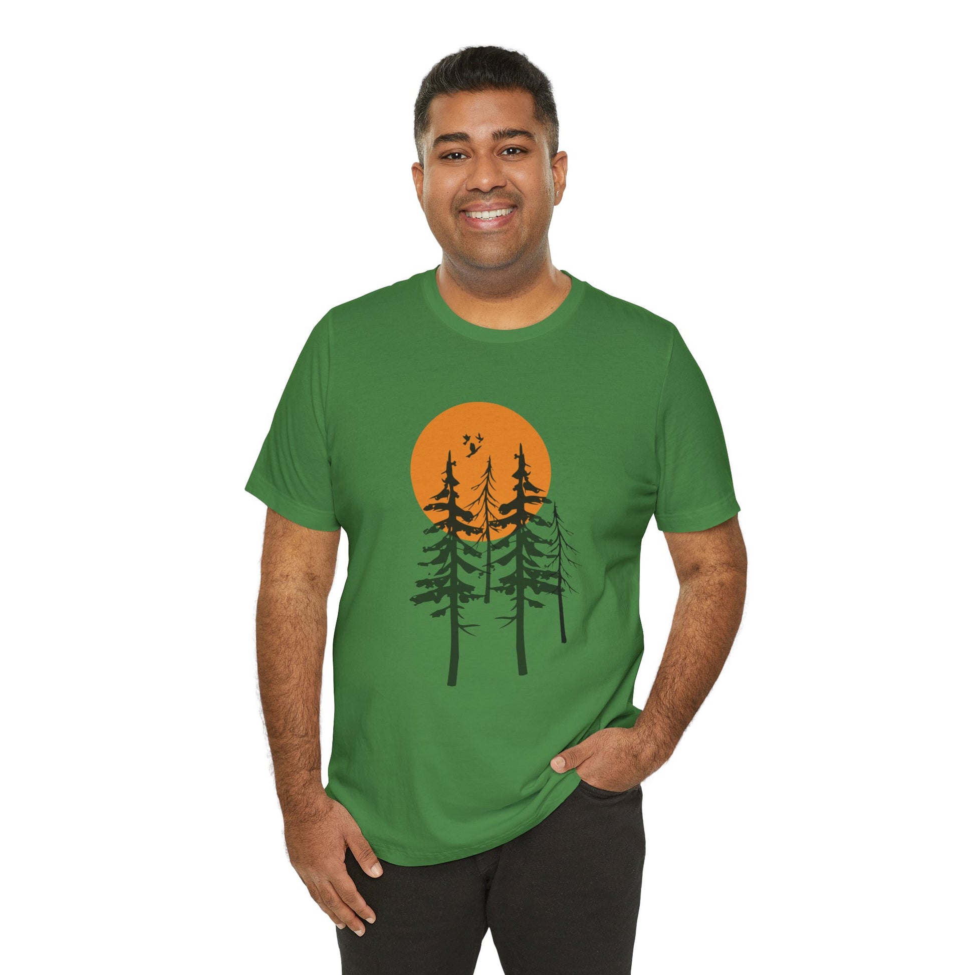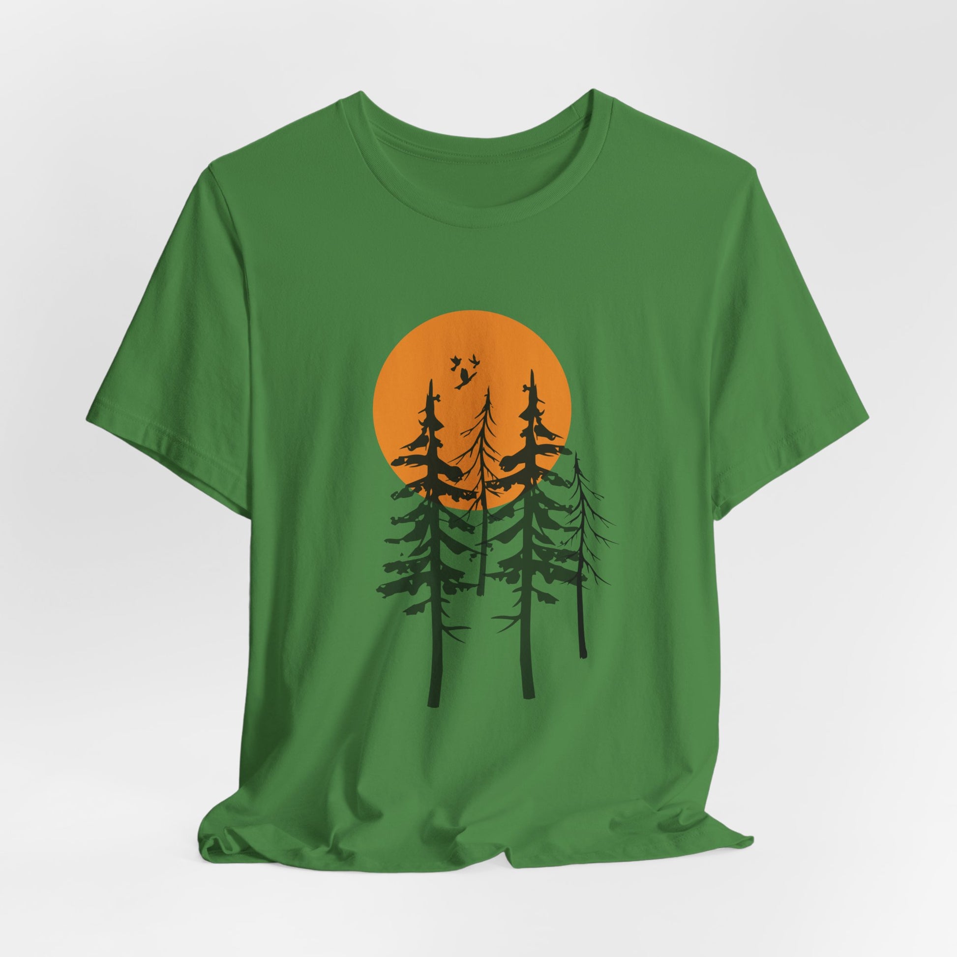 A graphic T-shirt featuring a sun rising behind some pine trees, giving off a serene and peaceful vibe. Perfect for nature lovers, outdoor enthusiasts, and those seeking a calm atmosphere. Ideal for wearing on outdoor adventures, camping trips, nature walks, or simply for a casual laid-back look. Relevant for Earth Day, Arbor Day, and nature-themed events.