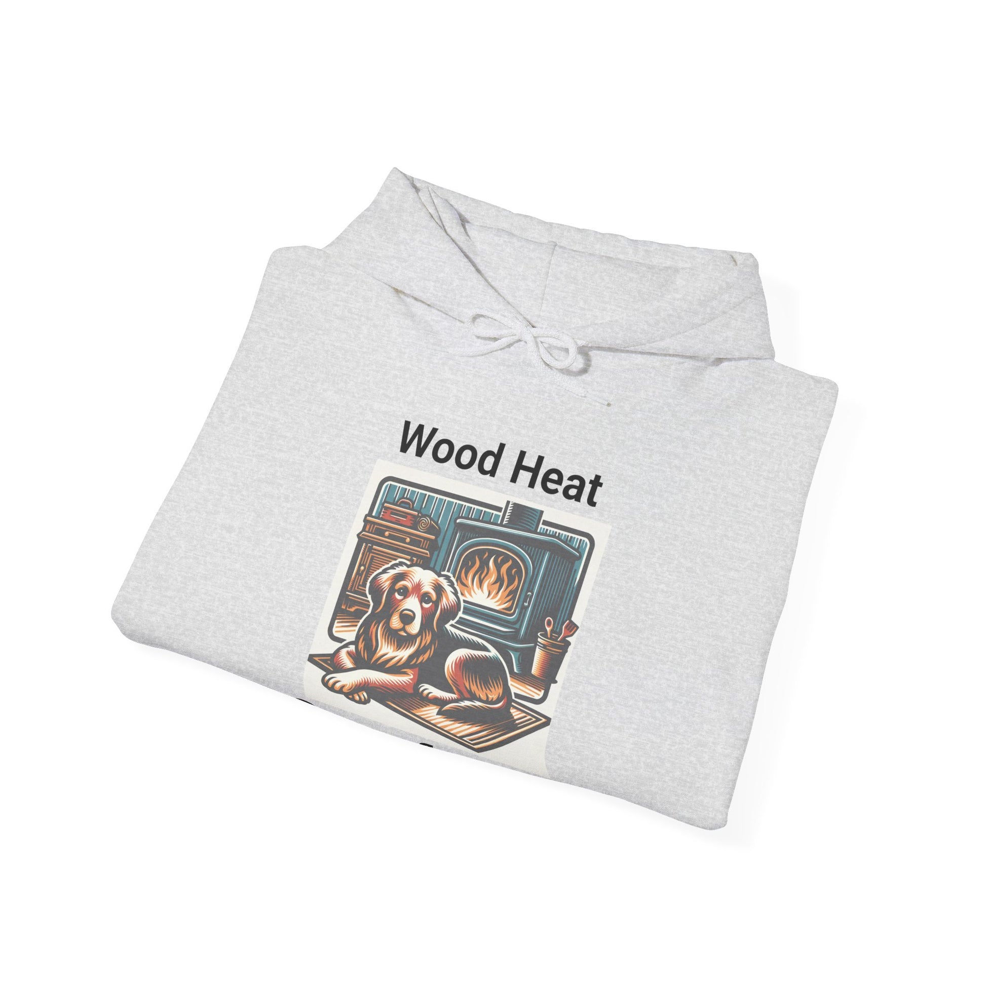 Stay cozy and stylish with this Unisex Heavy Blend™ Hoodie featuring a graphic of a dog laying in front of a wood heater and a text that reads 'Wood Heat Puppy Approved'. Perfect for dog lovers who enjoy a warm and comfortable hoodie during the winter season. Great for casual wear and lounging around the house.