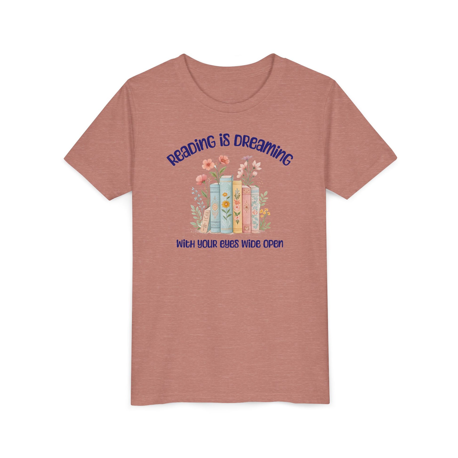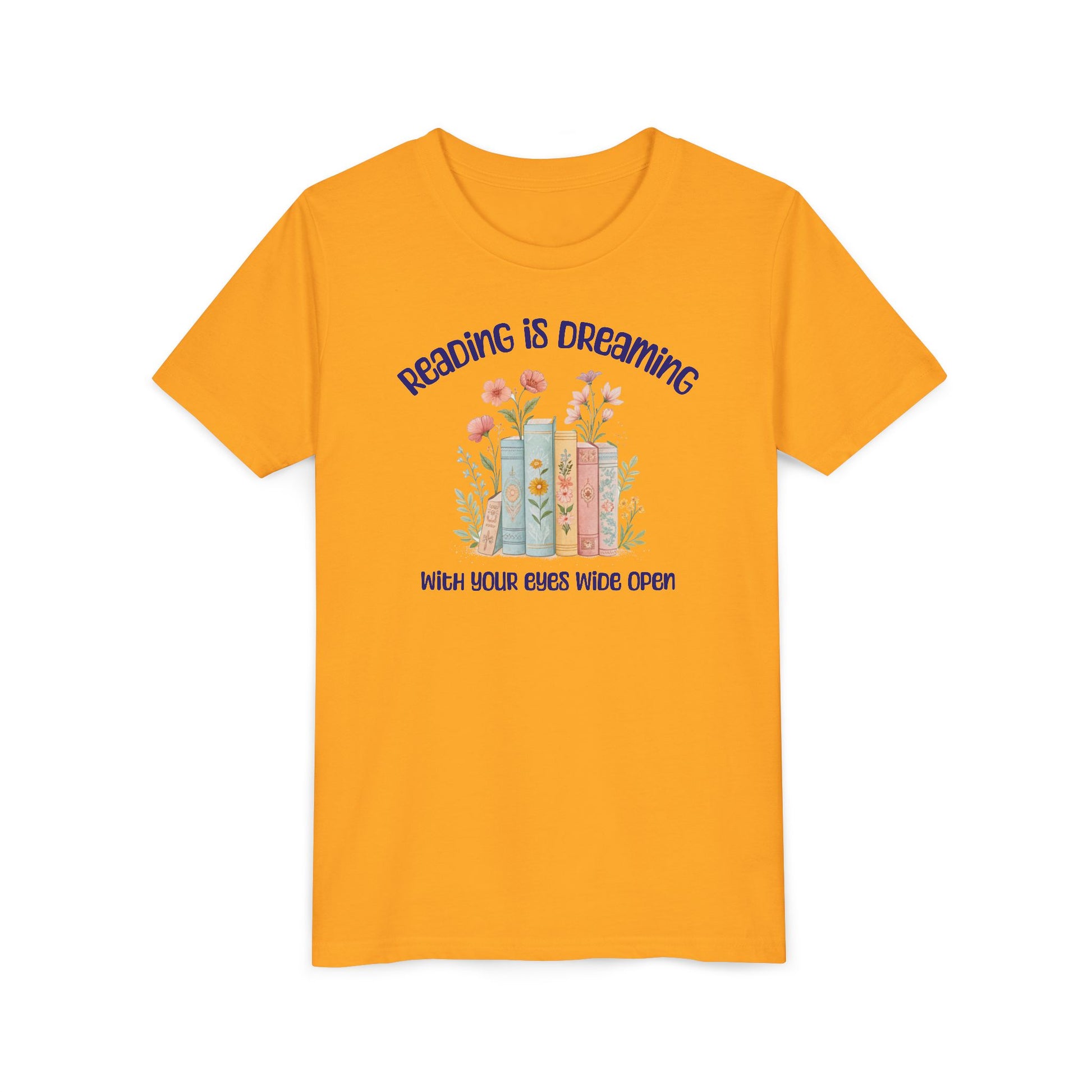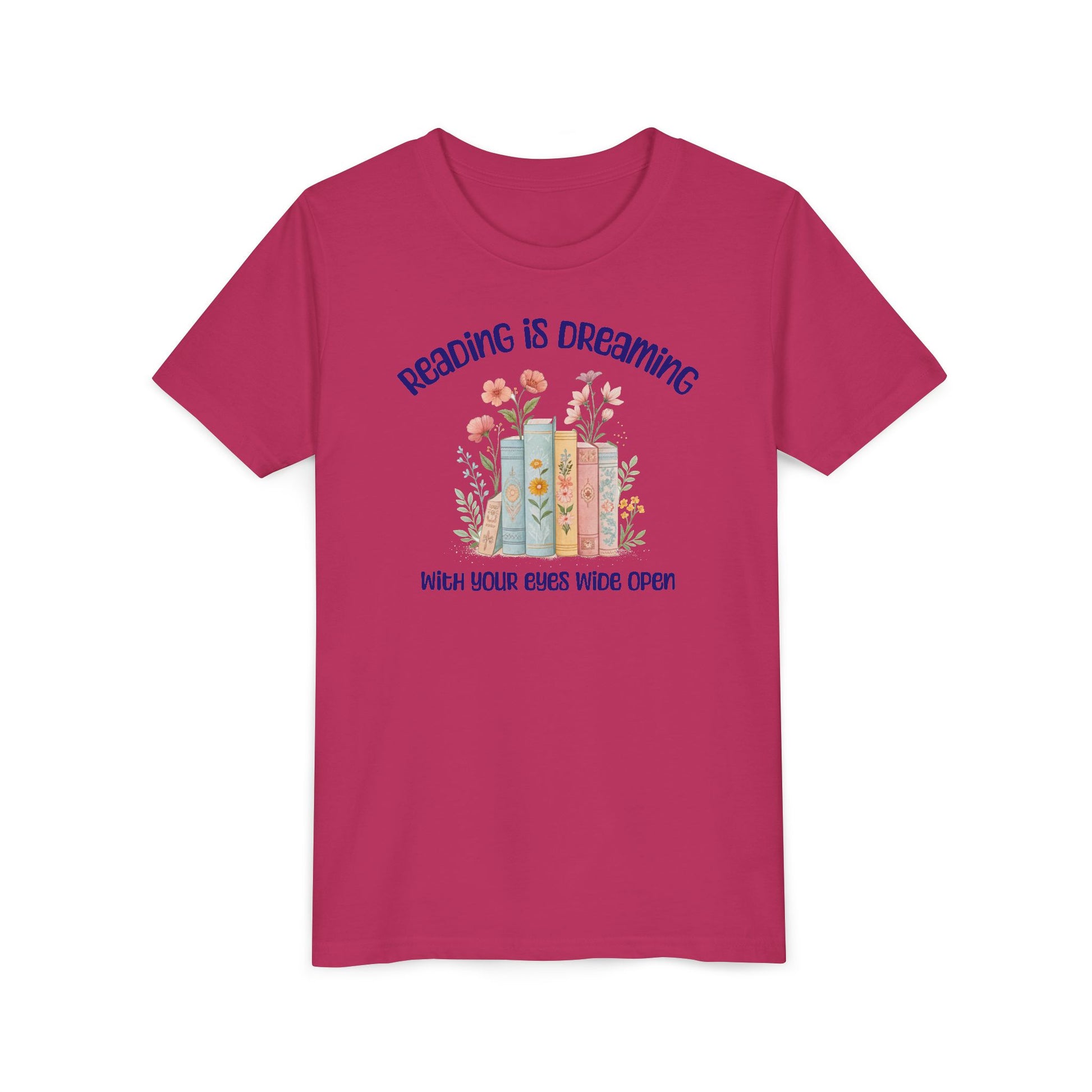 Youth Tee — "Reading Is Dreaming With Your Eyes Wide Open" Floral Book Graphic
